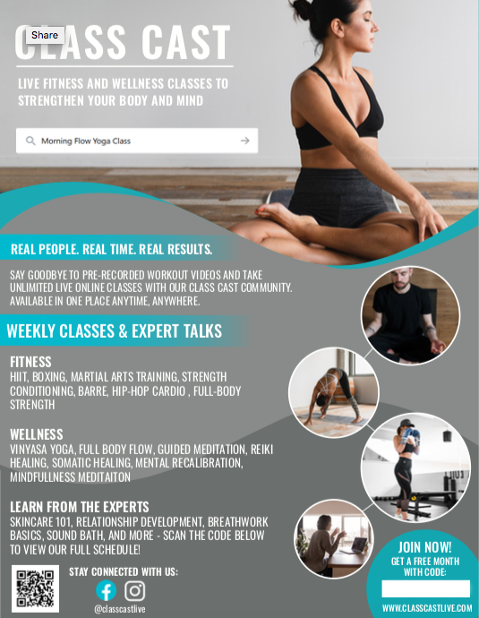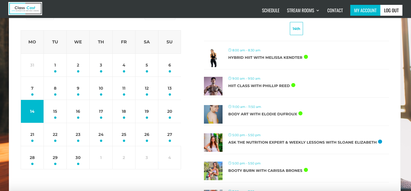 Class Cast Live is a community of individuals looking to workout both their body and mind. Classes are taught via 2 way video embedded into the site for a true community feel where you can interact with instructors in real time. With a robust class schedule of 40+ LIVE classes a week, we have something for everyone. From Boxing, HIIT, Yoga, Strength and Boot Camp to Meditation, Breathwork, Reiki and regular expert talks from dermatologists, nutritionists and more!