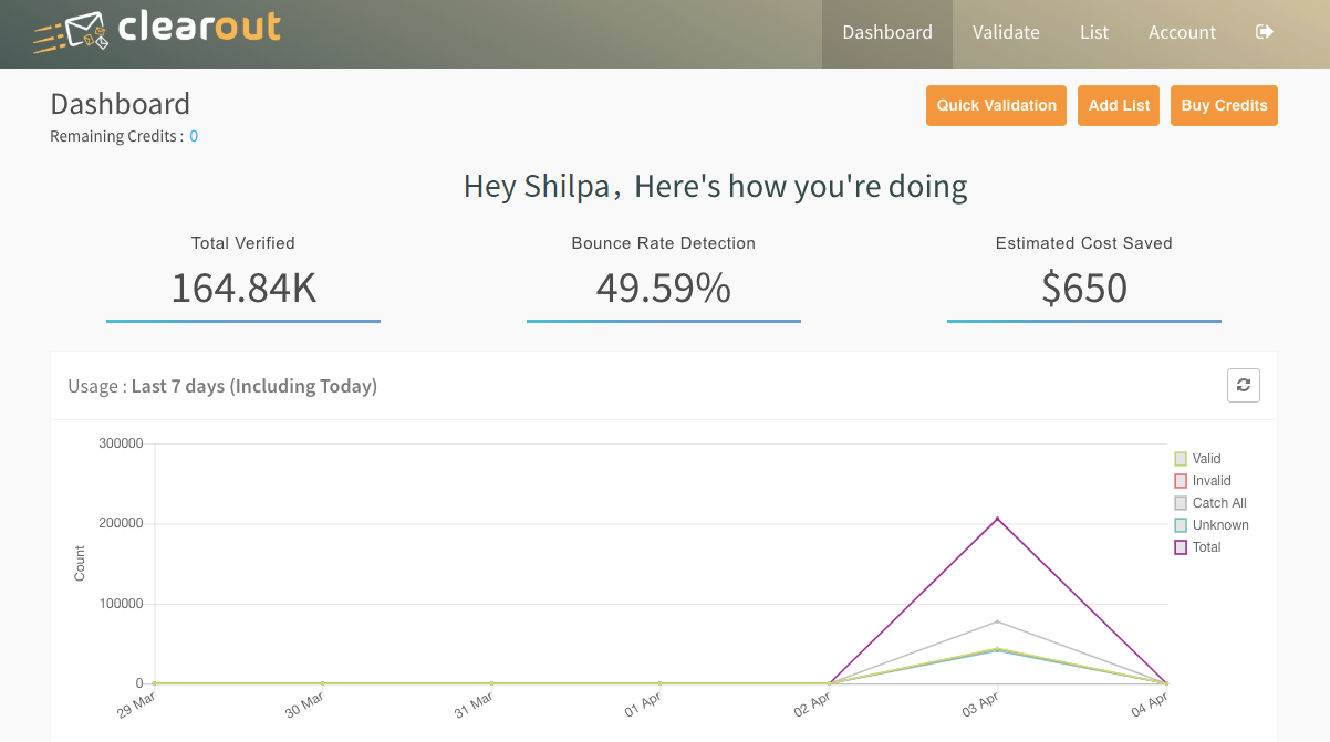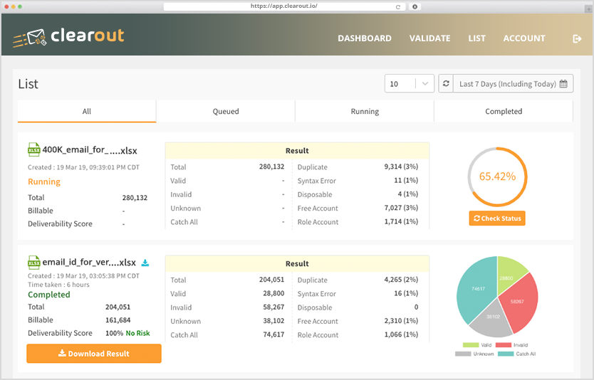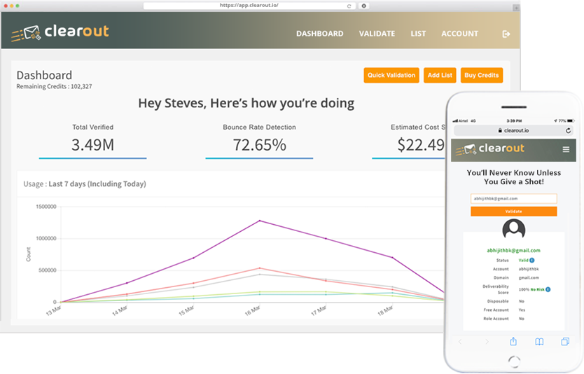 Best Email Validation, Email Checker & Email Verification Tool. Using Clearout remove invalid, disposable, spam-trap, syntax and deactivated emails & maintain your domain credibility. Clearout is a great way to protect your sender reputation for email marketing. Clearout is a fast and easy to use email validator, & it also includes an API.