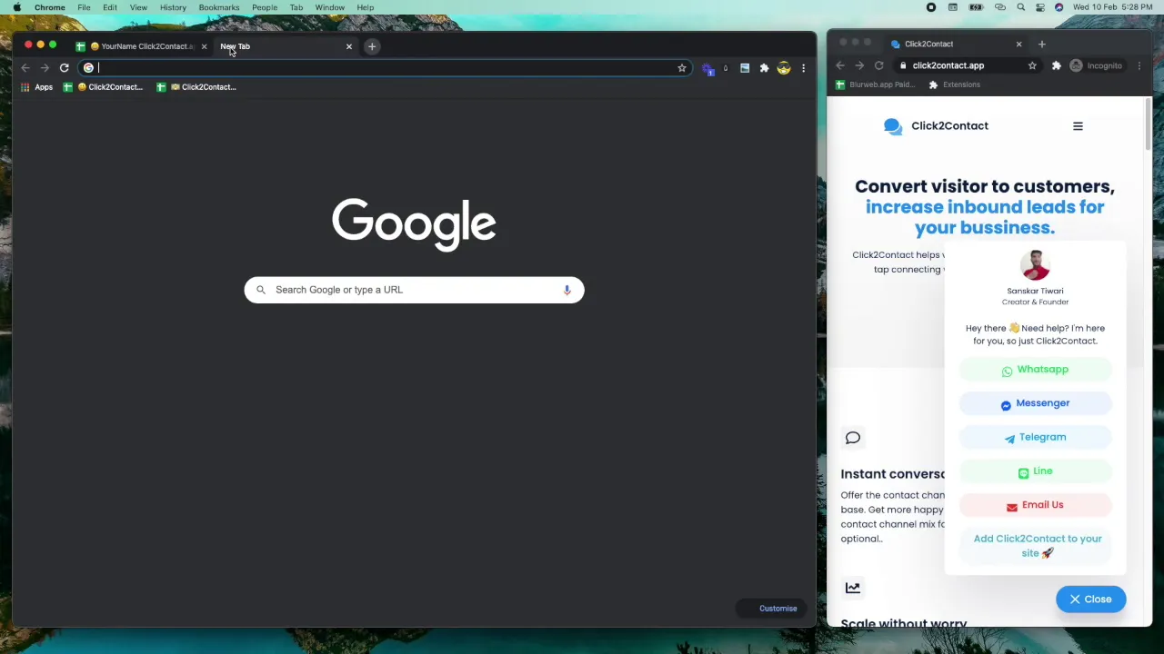Click2Contact App makes contacting business and website visitor as easy as single click. 1. Click to call 2. Click to message 3. Click to message on WhatsApp with customer pre defined message opens in app on mobile 4. Click 2 message on Messenger opens in app on mobile, telegram, Viber, Skype 5. Click to email, click to message on line and more.... 6. Also you can add custom button just provide label and url 7. Includes unlimited page views