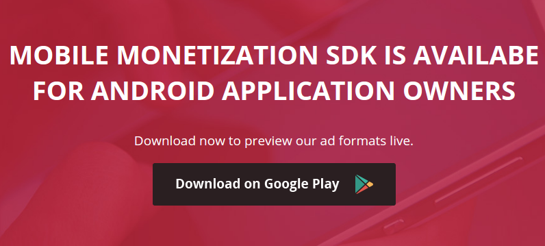 An automated platform for mobile monetization. 20+ formats, $50 bonus, 120+ countries,100% fill rate. Mobile monetization formats : > GIFT ADS > INTEXT > VIDEO > DIALOG > EXPANDABLE > NATIVE ADS > RICH MEDIA > NATIVE API