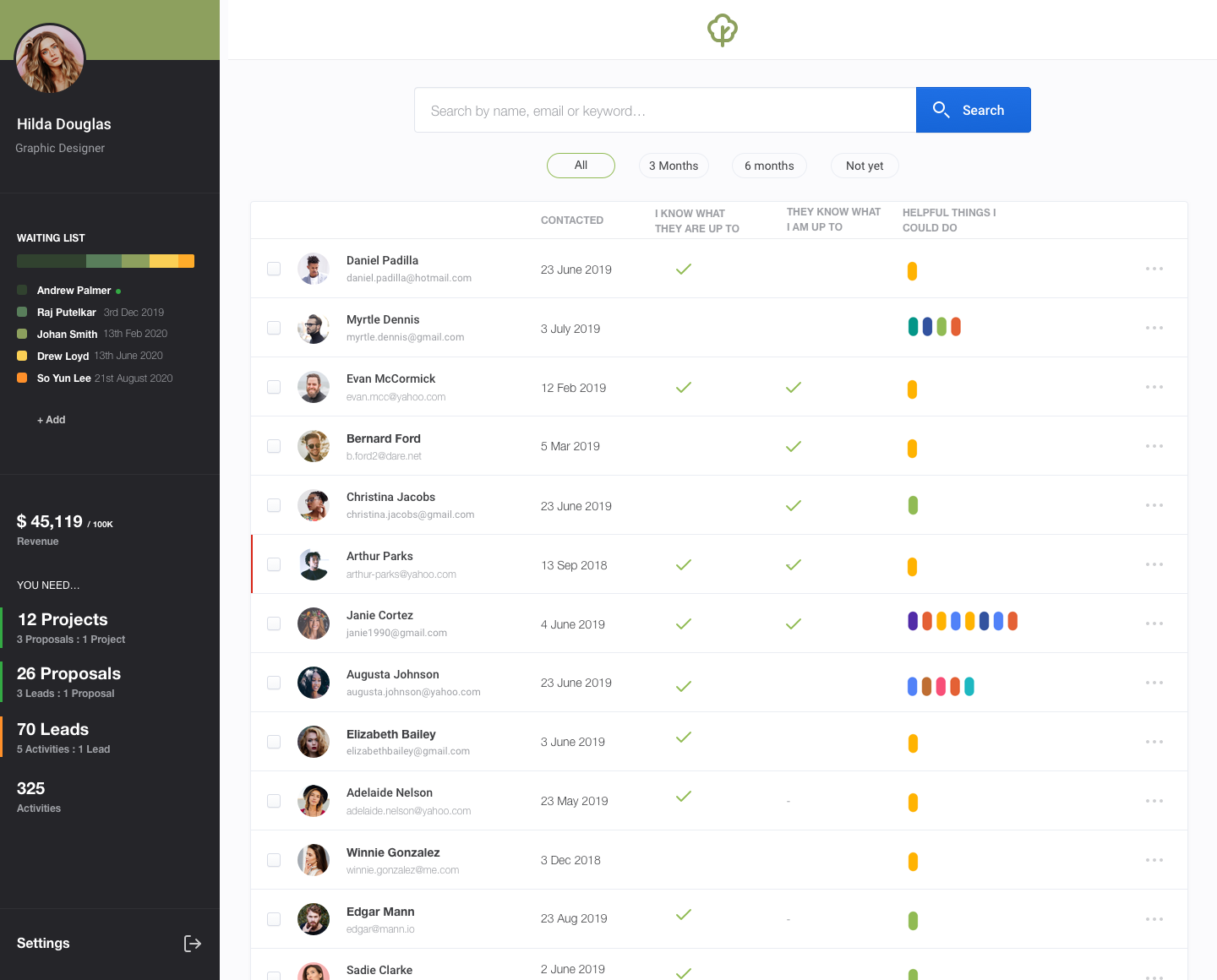Most professional freelancers get the majority of their work from word of mouth, yet they have no system in place to make sure they are using that to their advantage. The Client Tree app will remind you to get in touch with your network at frequent intervals and be helpful to your network so that you have a healthy system for word of mouth marketing. You can also add reminders when you're on the move so that you always follow up on things you've committed to and don't let things fall through the cracks Client Tree helps remote freelancers do the work they love with their favorite type of clients by developing good habits to stay in touch with people. It is currently based on invitations only. They provide a one month free trial for remote freelancers.