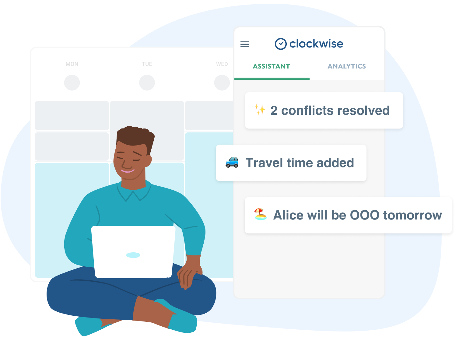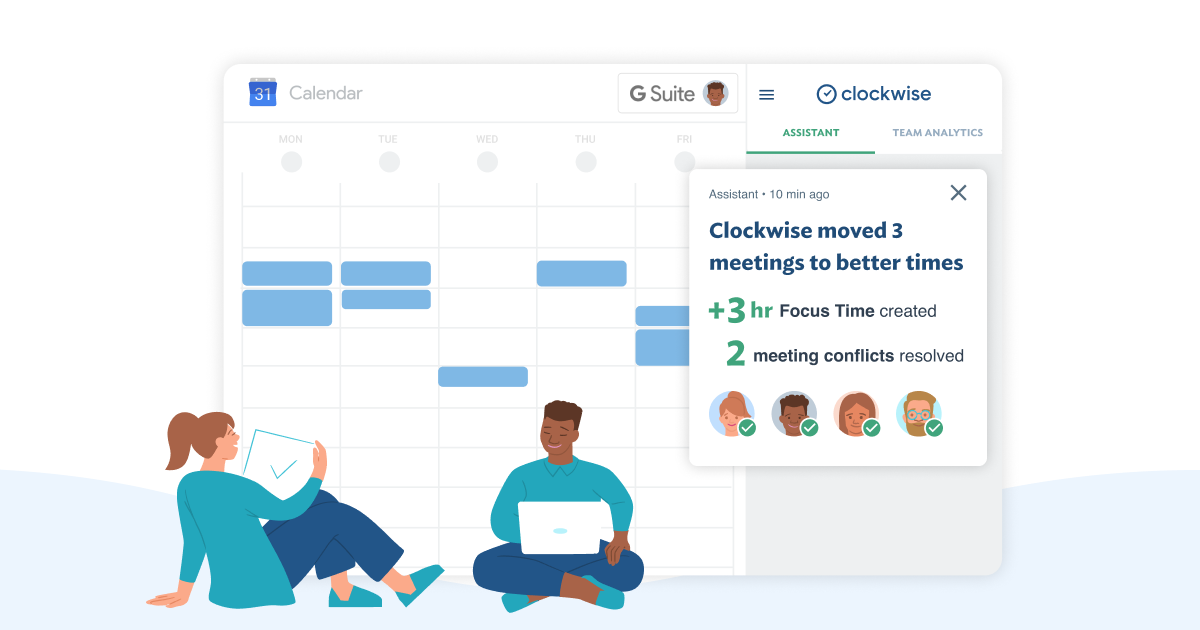 Escape the chaos of work and find your focus with Clockwise Clockwise is an intelligent calendar assistant that frees up your time so you can focus on what matters. -Clockwise optimizes your calendar to free up blocks of uninterrupted time. With Clockwise you can finally find time for what matters, whether it's a research project, a strategic plan, or your next big idea. -Struggling to get things done during the work day? Clockwise creates uninterrupted blocks of time to get things done and to focus on your most important projects. -Focus on your work, not micro-managing your calendar You can count on Clockwise to take care of the busywork, like resolving meeting conflicts, handling different time zones, and always saving time for lunch. -Design your day around how you work best Are you a morning meeting person or need to leave early to pick up the kids? Clockwise understands your preferences and helps carve out time for what's essential to you.