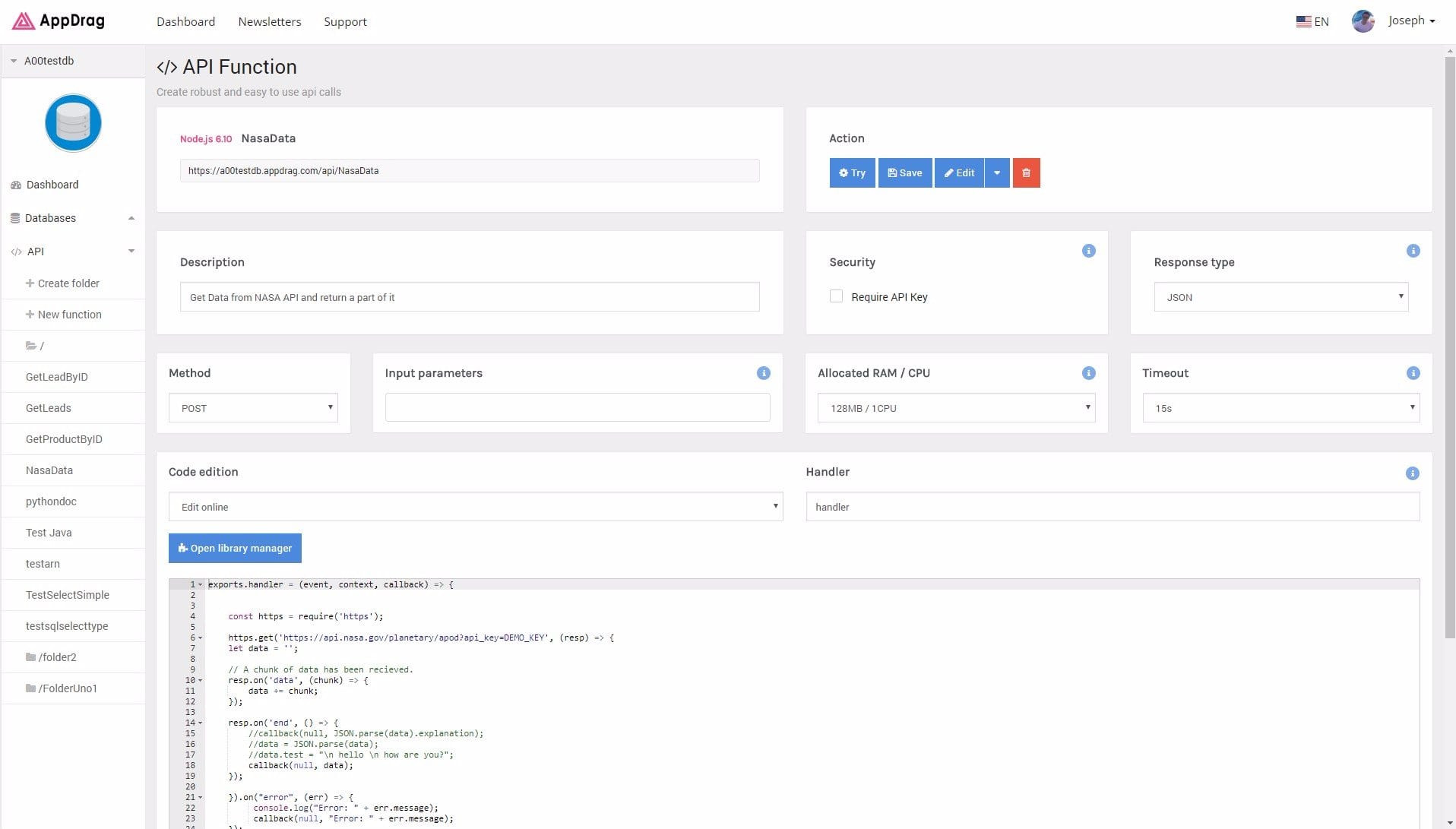 Cloud Backend is a scalable & affordable solution for your backends. Teleport your skills in the cloud. Create powerful API's and Databases without all the complexity You can write your cloud functions with Node.js, Java, Dot Net, Python, Go and more to come soon. Each cloud function is a microservice with an HTTPS endpoint directly available. With API Builder you can create cloud functions in minutes not hours, use our pre-made samples to address most frequent use cases in few seconds. You can also use Visual SQL to create API functions for CRUD operations very quickly. A testable API documentation is generated automatically and provide sample code usage for most popular languages (jQuery, PHP, C#, Python, Go, Java, Node.js, ...) For each new project where you need custom dev, usually you create a new database in mysql then configure a new website in your webserver and upload there an api template. In some case you even have to install a new VM for that, and install MySql, web ser
