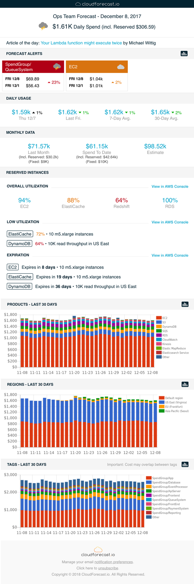 CloudForecast is a b2b SaaS platform that helps companies reduce wasted spend on Amazon Web Services. We're helping companies solve this $55bn problem annually through a set of easy to understand cost monitoring and optimization reports that can be sent via email or Slack. The report surfaces and summarizes any significant cost increases and possible missed savings opportunities so there are no surprises at the end of the month with your AWS bill.