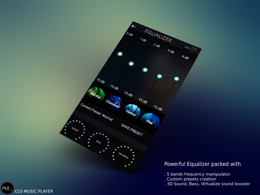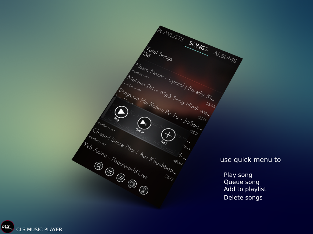 CLS Music Player app is the most stylish, Powerful and Fast Music Player app with stunning and elegant design. The 5-band equalizer offers powerful bass, volume and virtualize Sound booster to give real feel to music you are listening with hd sound quality. It also allows you to create and save your own custom preset. This Music Player app offers numerous variety of glassy, blurry and dark themes, which makes it very different from all other Audio player. CLS music Player is all format audio player which supports formats like mp3, m4a, aac, wav,midi etc. The search filter of Music Player app is very powerful; It allows searching songs based on Artists, Songs Title, Albums and Composer of the Music. This Music Player also offers tags editor, which allows editing Songs Title, Artists, Composer, Albums and Album Arts. Key Features of Music Player : - Plays all audio formats - Powerful 5-Band frequency Equalizer. - Bass, Virtualize Sound with 3D sound effect and volume raise Manipulator - Numerous Dark, blurry and Glassy Skins to give feel to your music - Tags Editor – allows editing Songs Title, Artists, Composer, Albums and Album Arts. - Swipe left or right on playing song screen to change songs - Ability to sort songs on Artist, title, Modified Date, Albums and in descending order - Folder Explorer to play songs from file paths - Powerful songs Queue and Songs Repeat mode - Create, Remove and Rename playlists - Play whole Playlists on one click - Recently and mostly played Playlists - allows to see what was played before - Multi select option to Queue, Delete multiple songs.