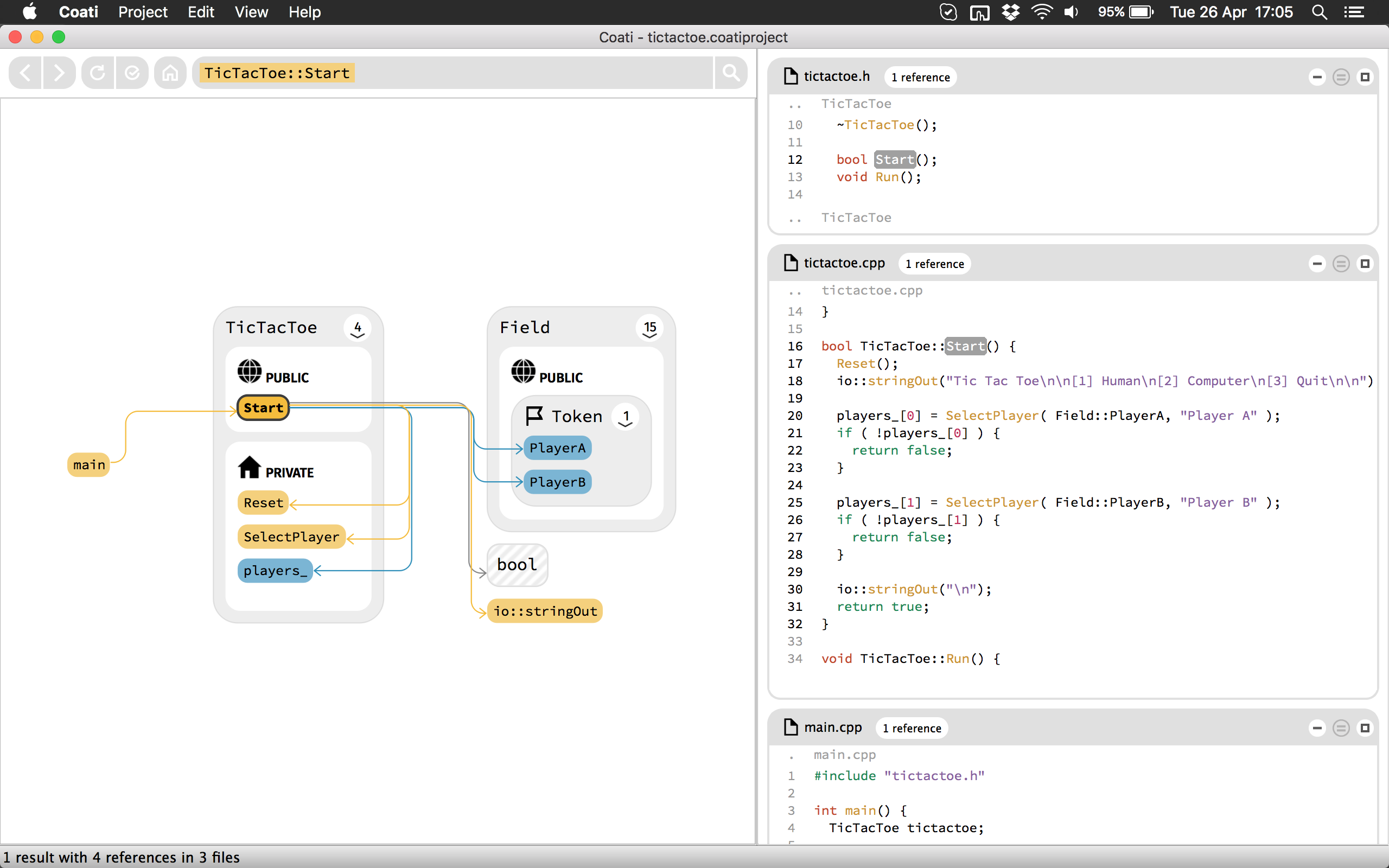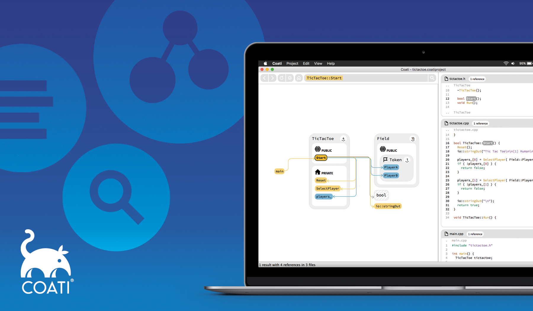 Software developers spend up to 70 percent of their time figuring out how existing source code works, but common code editing tools offer little help for this task. Coati helps software engineers explore and navigate unknown source code quickly and thoroughly by combining an interactive graph visualization, a concise code view and a powerful search algorithm, all built into an easy-to-use cross-platform developer tool.