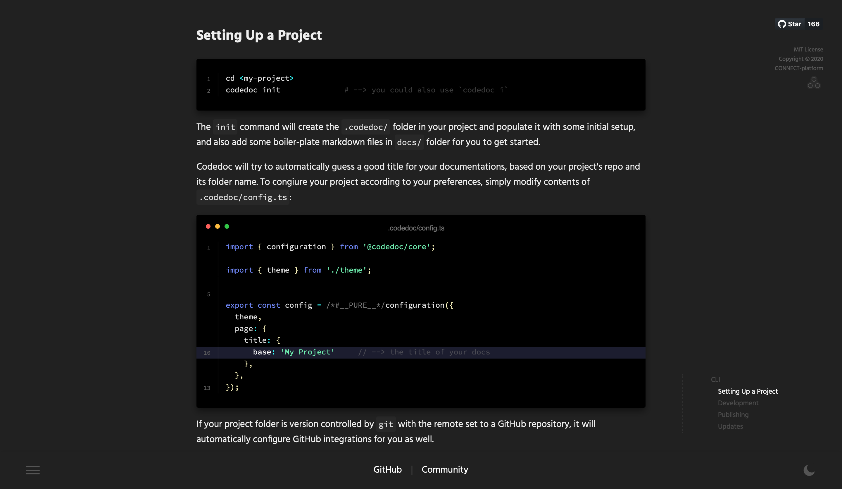 CODEDOC is an open-source tool that helps you with creating beautiful and modern software documentation. It creates a JAMStack app from your markdown files that you can easily deploy on services such as GitHub Pages. Features: - Enhanced Markdown with Custom Components - Enhanced Code Snippet Features: highlights, hints and references - Extremely Customizable - Integrated Search - Integrated Dark Mode