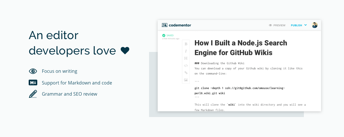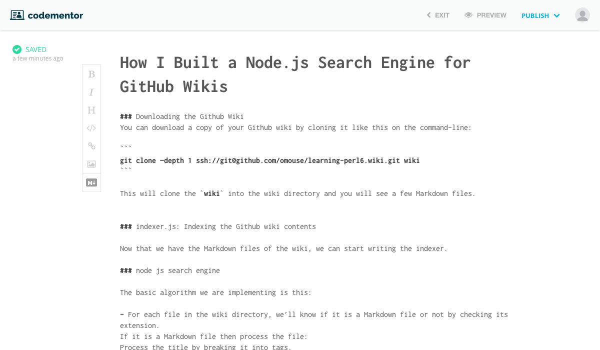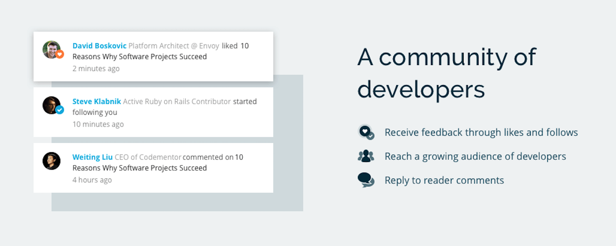 Codementor Community is expanding what it means to provide mentorship to software developers. It is a learning community where developers can easily share their knowledge with a broader audience, exchange ideas, and learn from each other. We’ve built a lightweight, developer-friendly, markdown-powered editor that makes writing enjoyable and distraction-free. Share what you’ve been working on, write a technical tutorial, discuss the latest technologies, and more. We even offer an optional grammar review! This is only a small step in our journey to become a learning community for everyone from senior developers to beginners and everyone in between, and we understand there may still be many important features missing. Let us know if you have any questions or feedback!