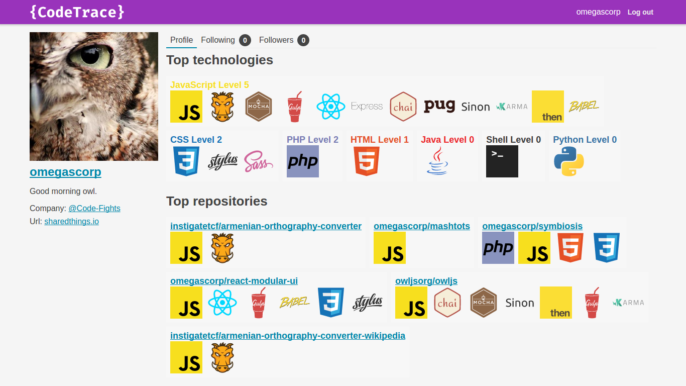 CodeTrace.io analyzes your GitHub profile and shows your development skills such as programming languages, libraries, frameworks and databases.
