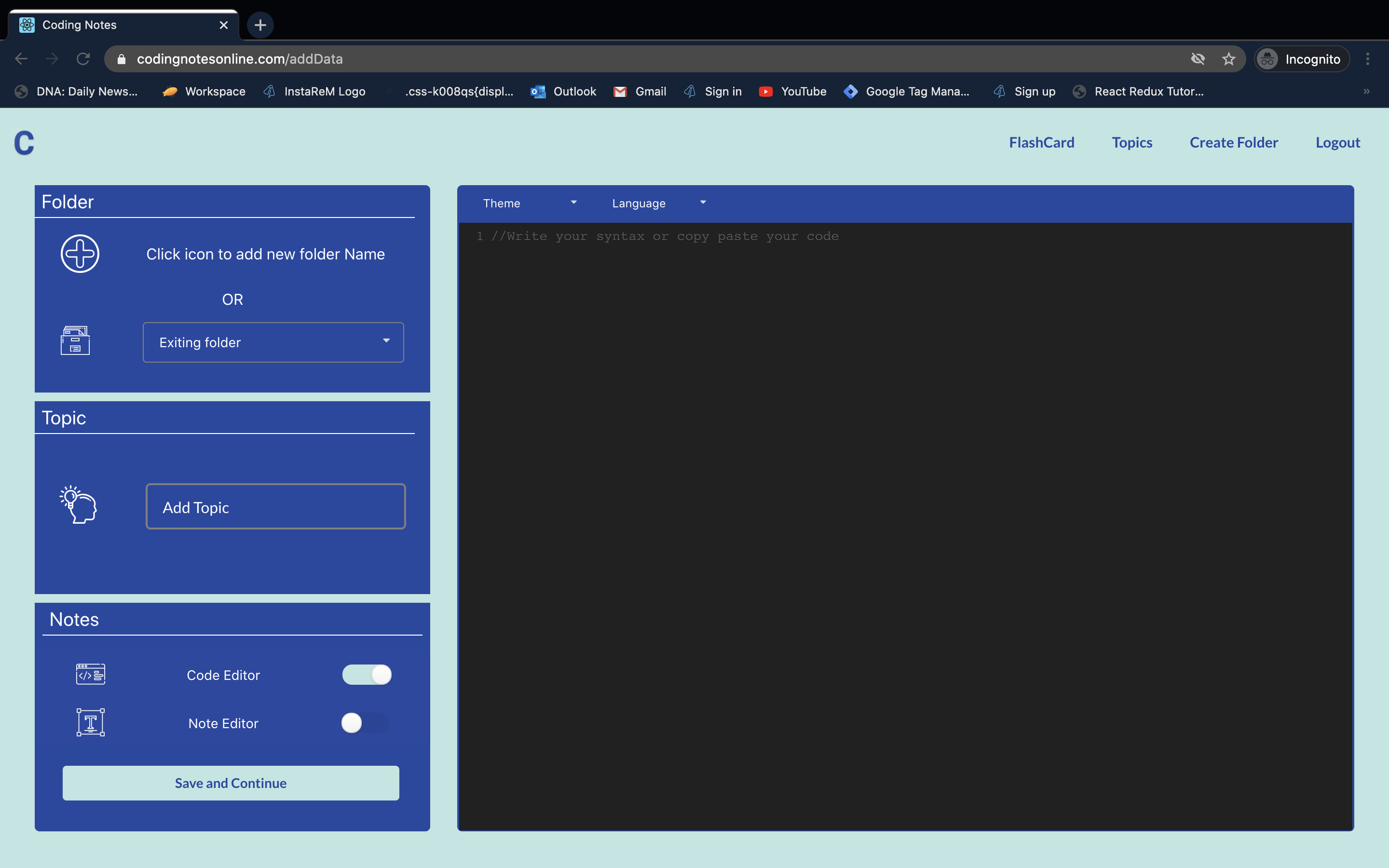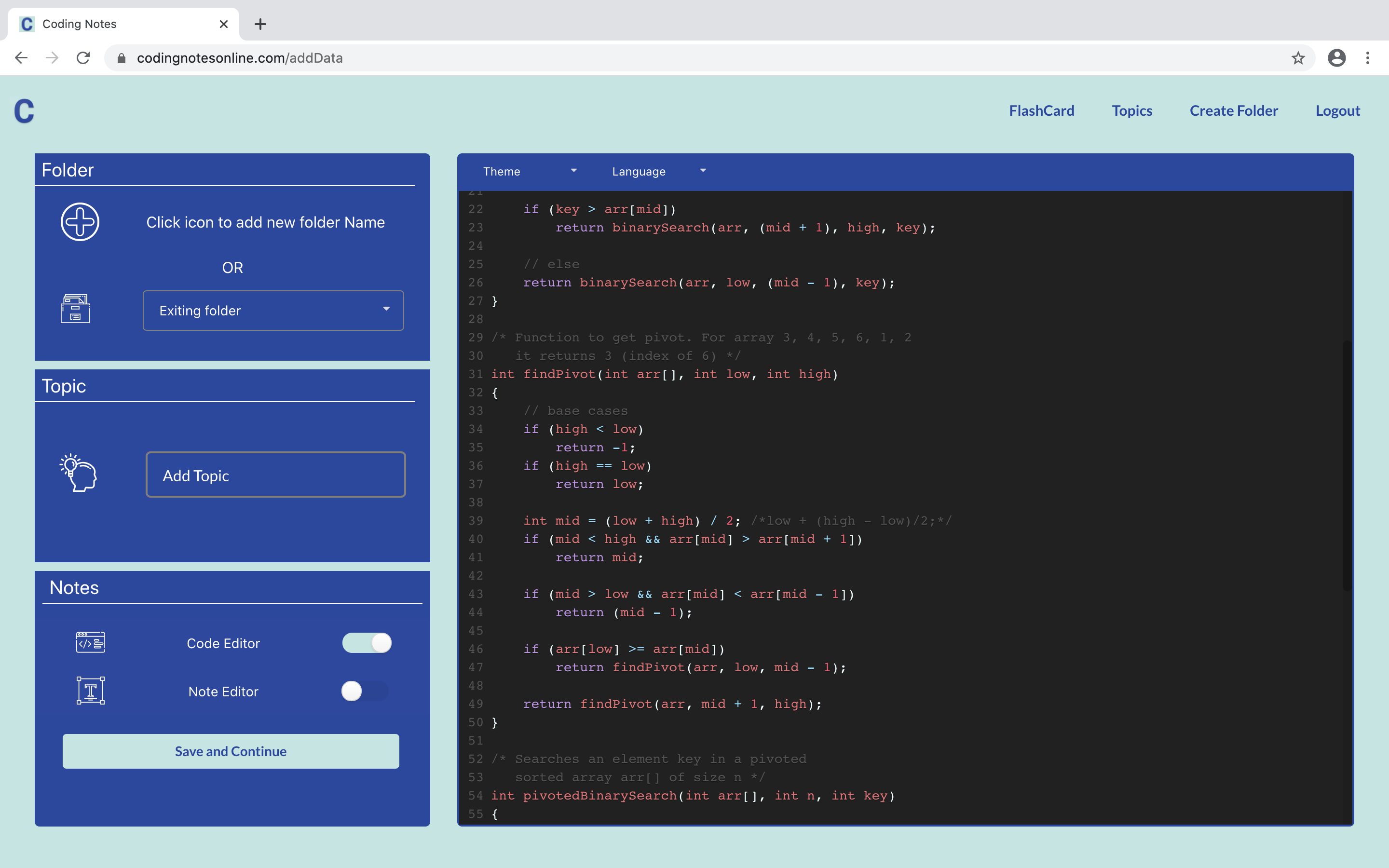 Hi Everyone, Just as every junior developer practices a lot of algorithm-based questions to crack interviews in top companies. I am on a similar track and while doing this I found that there was no specific tool where I can store my solutions or notes that suit my requirements. It started as a personal project but now I feel like it could be useful to others too. It is a simple platform that makes easy for you to handle your coding notes, packed with some useful features such as -Creation of topic wise folders, -Code syntax highlighter -Flashcards & graphical representation for effective learning and smart preparations