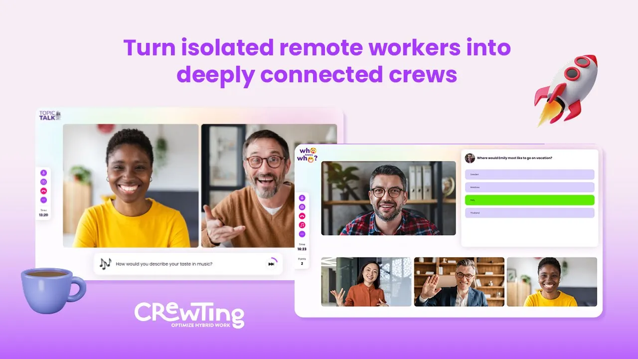 Discover a whole new world of unique coffee breaks. Employees jump directly from Slack in our coffee break environment and enjoy an interactive content moderation. Create bonding experiences, strengthen your company culture and have fun.