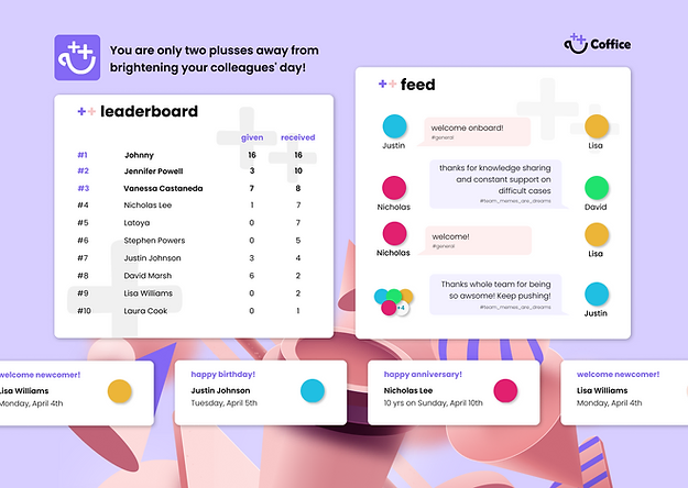 Coffice promotes inclusivity and community spirit by ensuring that everyone’s milestones, such as birthdays and work anniversaries, are celebrated. Its integration with BambooHR automates the process, ensuring no one is overlooked. This helps to knit teams closer together, creating a supportive environment that values every member's personal and professional milestones.