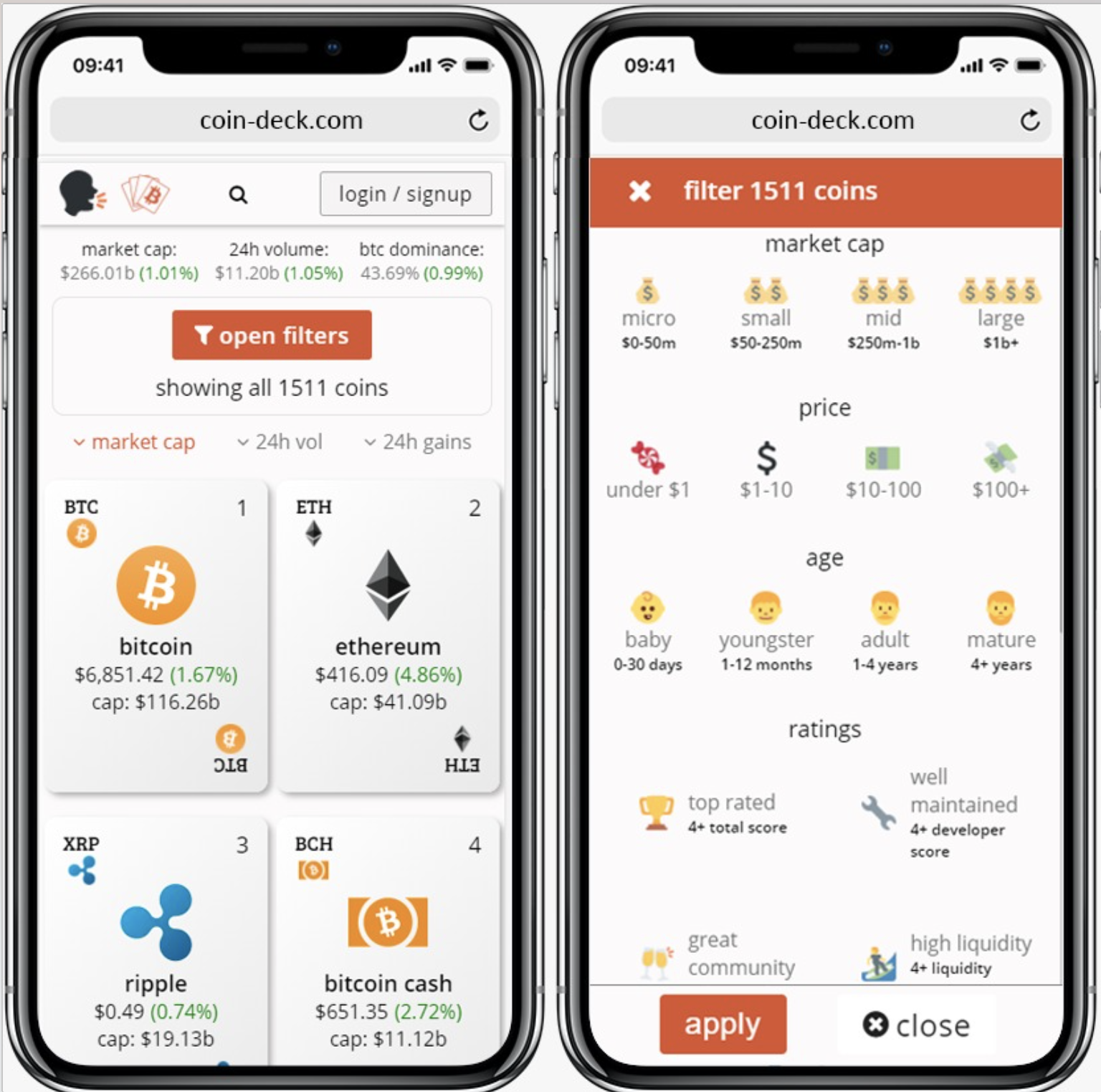 coin-deck lets you find cryptocurrencies through the use of extensive filters and sort options. Discover coins that are best suited for you. Add them to your watchlist to follow their progress and add the ones you hold to your portfolio deck to track your earnings.