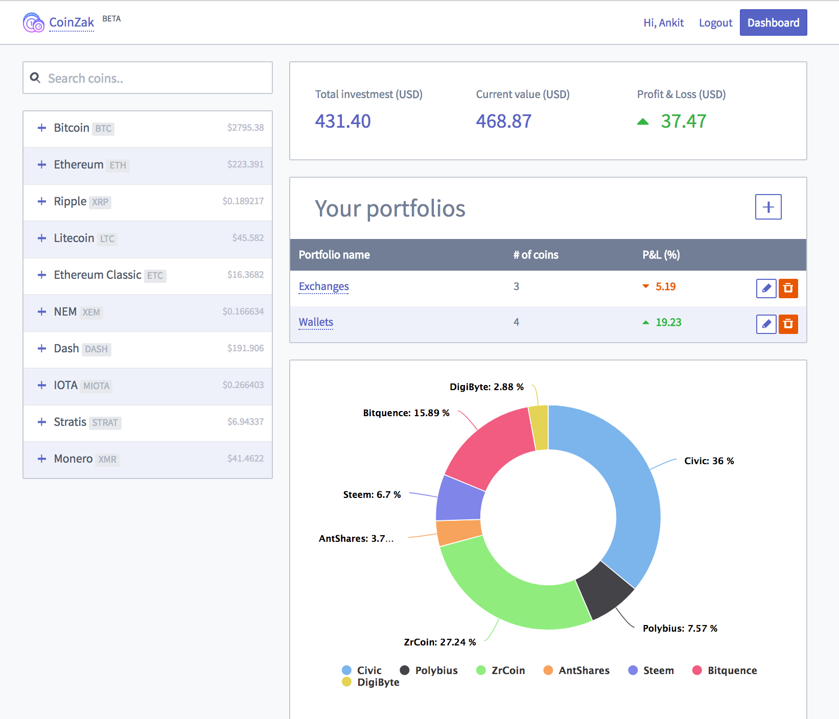Coinzak is here to help you manage your crypto profile and let you keep an eye on how those ups and downs in the market are affecting your portfolio. Now no more managing excel sheets of your investments in cryptocurrency. Manage your crypto portfolio with ease and get to see your investment break-up, Profit/Loss etc through neat graphs. Draw more insights through the data and make healthy decisions.