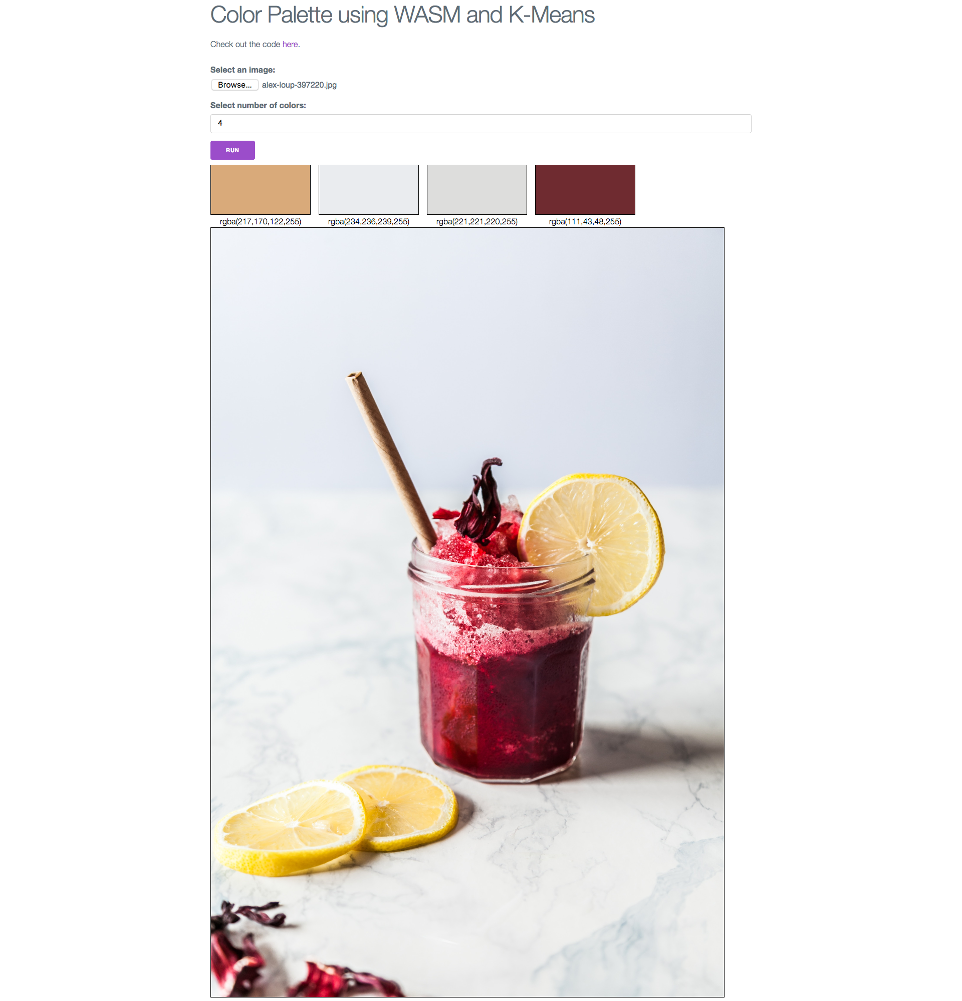 - Image is resized to maximum width of 1024 pixels - The number of colors corresponds to the number of clusters in k-means - K-means runs for 10 iterations or exits if less than 1% of pixels changed clusters - Cluster centers (means) are the actual colors that are drawn - You can hover over the colors to see which pixels belong to that cluster