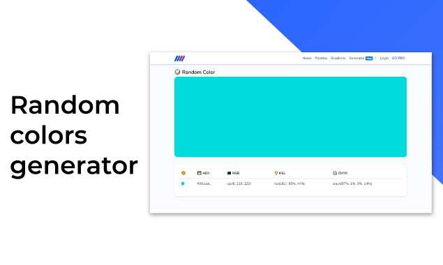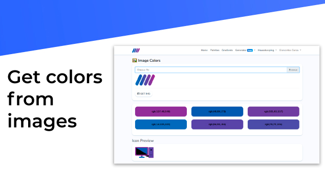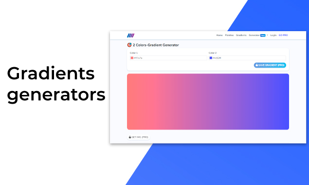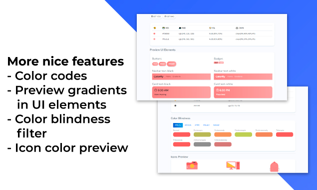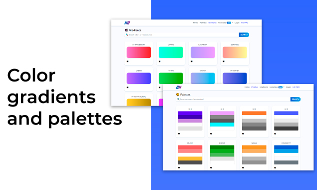 It's a design website, where you can search for color gradients and palettes, get color codes like hex, rgb, hsl and cmyk. Here are some cool features: Some cool color gradients and palettes with some color codes like hex, rgb, hsl & cmyk. Preview UI elements (buttons, badges, navbars, cards), with differents gradients, css codes and images downloads. We have some cool generators like for color gradients, random colors and get colors from images.