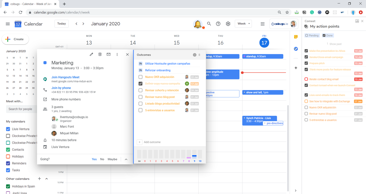 Comeet.me creates a shared space in each event to transform meetings into powerful collaboration. Meetings well prepared, focused, and into action. Follow the agenda points, write down, and share next-steps and take personal notes while in the meeting, without leaving the meeting. - Shared meeting notes. Collaborative agendas, notes, and to-dos automatically shared. - My tasks and overview. See all your meeting (and your peers) to-dos in a single view. - Private notes. You can take notes and to-dos only for you - Related meetings. Quick context of past meetings notes at one click. - Reactions/feedback. Provide your opinion about the meeting. - Quick Search. Search notes, to-dos, and related meetings in seconds. - Integrations. Calendar, GMeet, GDrive, Gmail, and Slack. Stop the Meeting Madness. Comeet supercharge your Calendar to make effective meetings easy and for everyone