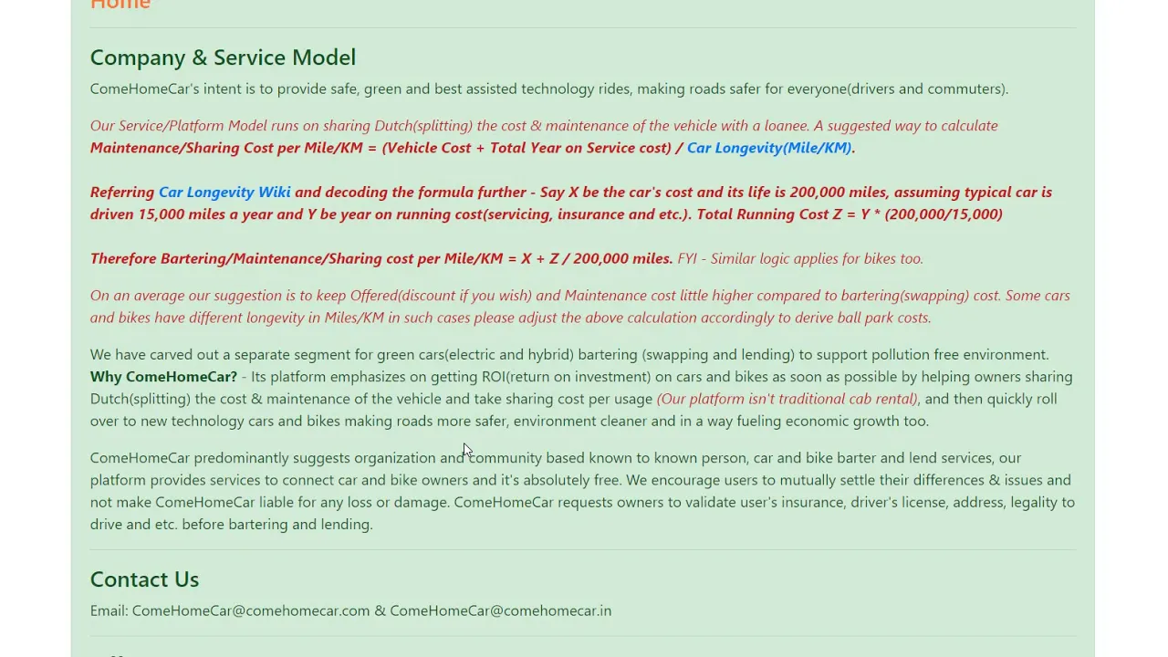 By car and bike bartering ComeHomeCar helps users get the best vehicle needed for his travel either in his stay-in community/organization and the owner gets a vehicle back so he/she doesn’t go off the commute, in lending there’s no swap of vehicles, an user gets to use owner’s vehicle. Our vision is to grow as a big community of commuters where the reach-out of common people ranging from SUV’s to Luxury cars & Bikes without any hassle. Every transaction with a growing network and providing limit less excess to all variant of vehicle possible