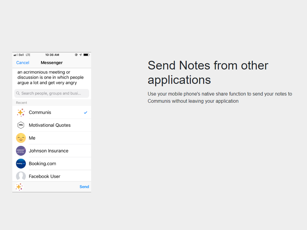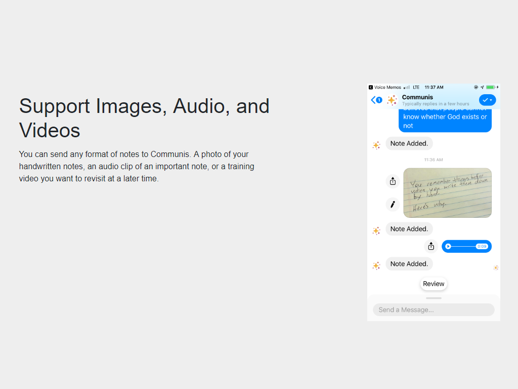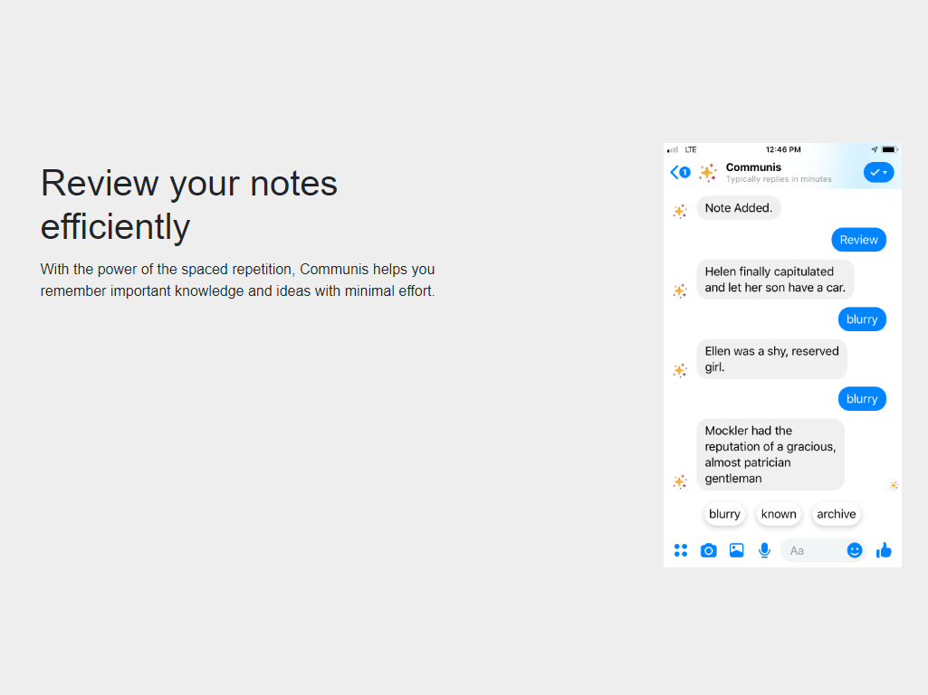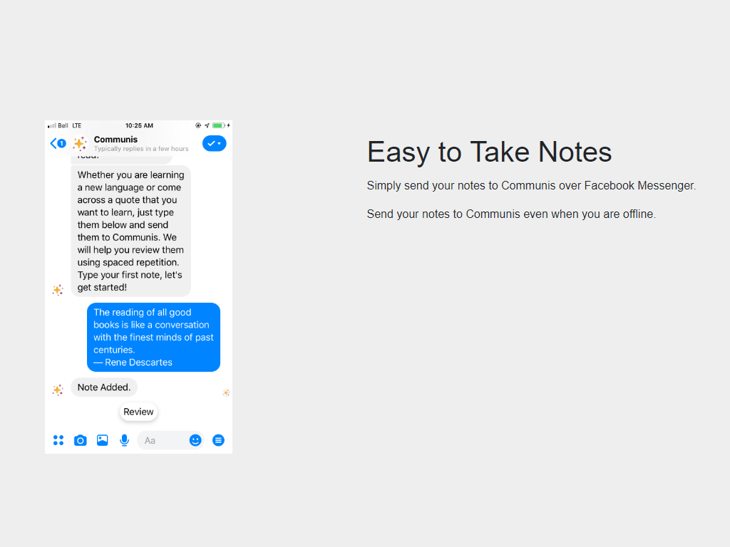 Communis is a chatbot built on Facebook Messenger helping people to remember what they have learned in the most effective way. Whether you are learning a new language, reading a book, or preparing a test, Communis is here to help you remember more with less time using spaced repetition. Search Communis in your Facebook Messenger, you can talk to Communis just like you talk to your friends. Any message sent to Communis will be stored as a new note. You can then review them simply by clicking the review button. Communis adjusts your notes’ review interval dynamically based on your feedback. Not only can you send text notes, but also images, audio, or videos to Communis.