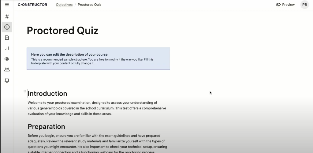 Constructor Proctor is an AI-powered online proctoring solution designed to ensure academic integrity during remote assessments for higher education, enterprises, certification centers other educational institution, etc. It provides: - Automated identity verification using facial recognition - Secure browser lockdown - Multiple candidates' real-time monitoring and analytics - Detailed session reports - Open API (seamlessly integrate with any LMS)