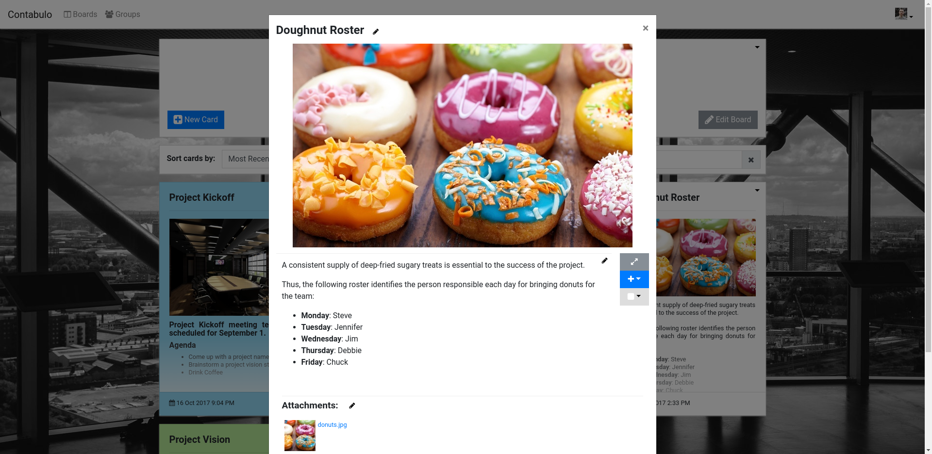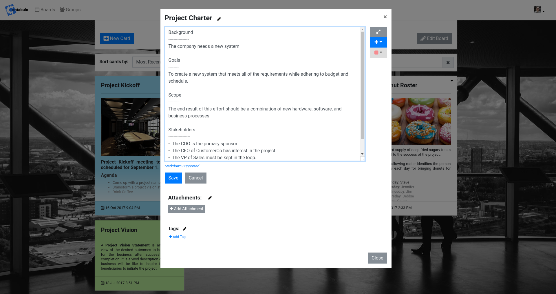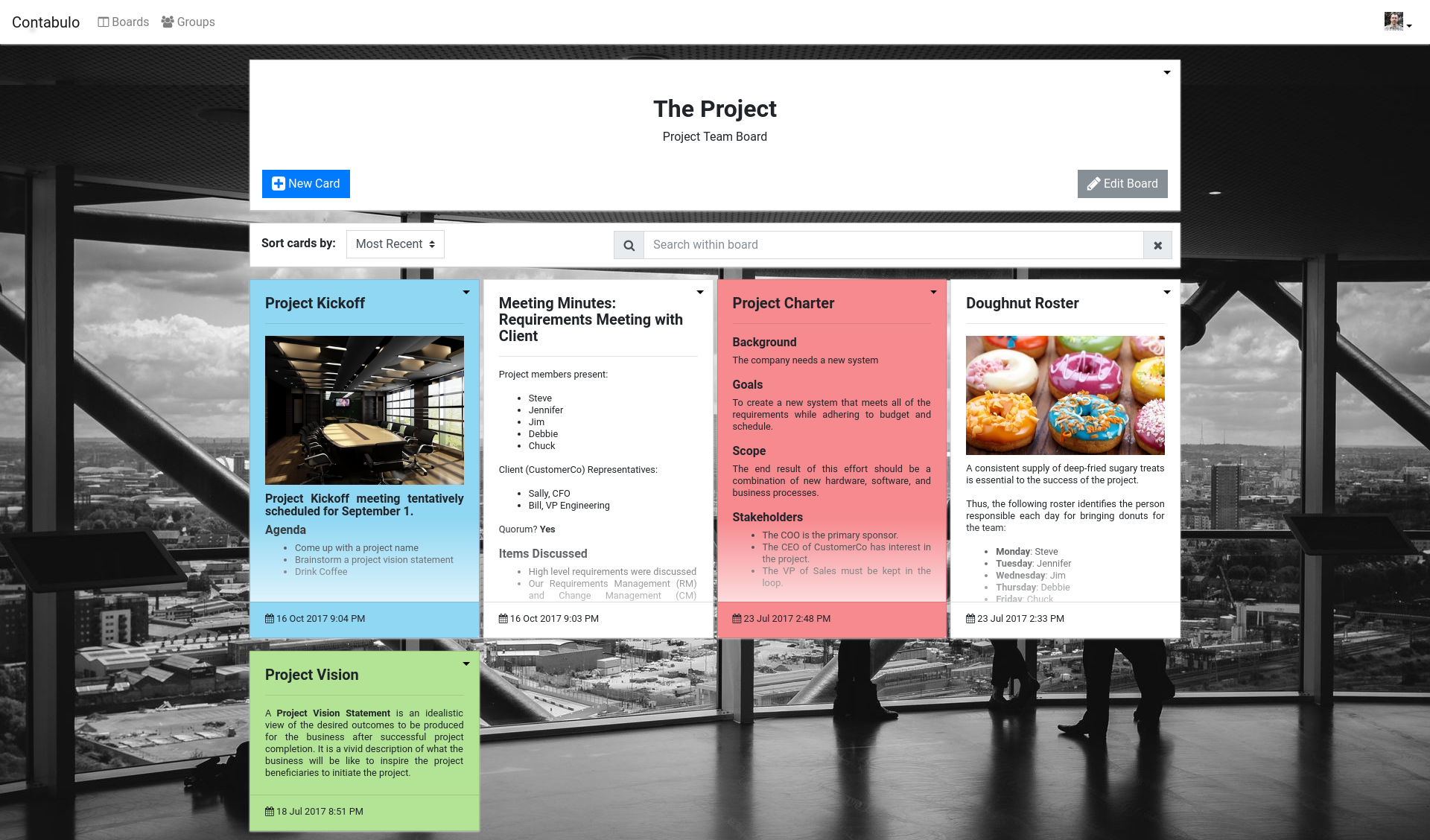 Contabulo is a general purpose board suitable for knowledge management, project planning, and team collaboration. Contabulo can serve as a corporate wiki, a project planning and tasking board, or as an asset storage and management tool. Contabulo's "cards" are flexible and can contain anything from short notes to full wiki articles. Additional card features include checklists, file attachments, and more. Industry-standard markdown format makes editing and formatting text easy and simple. Contabulo cards can also be assigned different colors and tags to enable users to easily categorize and later visually identify cards and information. Boards can be either private (for an individual's use) or can be assigned to a user group. Group boards enable a collection of users to access a board for team collaboration and information-sharing purposes. Within a group, each member can be granted read-only, write, or admininstrative access to a group and its boards.