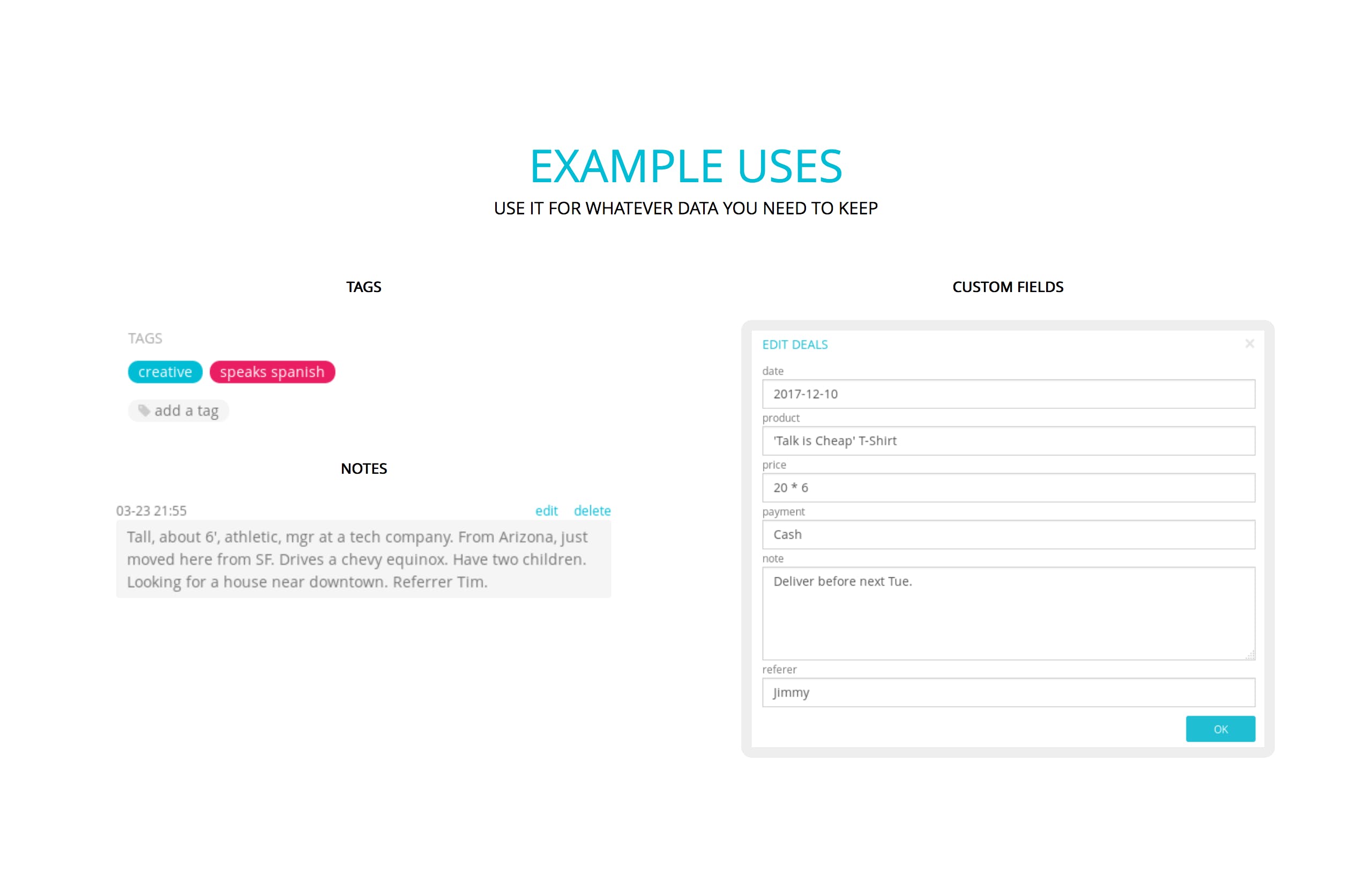 Contalist is built to help professionals to work efficiently with their contacts, clients, members, or whatever. You can add notes, tags to your contacts, create custom fields & forms to organize your contact's profile, even keep their orders, appointments. Contalist allows you to create custom fields in different types, e.g. checkboxes, links, images... You can easily capture different types of data. Forget your spreadsheets, you will be much more productive with Contalist. Also Contalist comes with a few extensions to help you reach out to contacts. For example, you can segment your contacts and send personalized group emails with mail merge. Build web forms to collect contact data. You can send contact specific link to your web forms, so once a form is submitted Contalist can link the submission to the right contact. Never need to process the data manually. Enjoy!