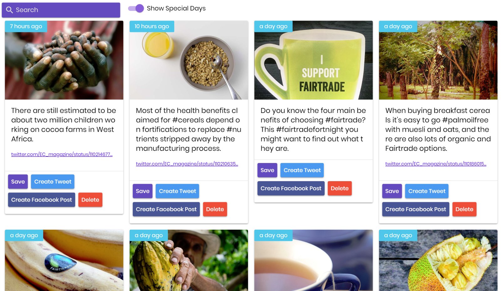 Content Hub allows you to curate content related to your business or project from anywhere online. You can then easily turn that content into messages that you can spread to Facebook, Twitter, LinkedIn, and of course your own news streams in your app or website. Content Hub analyzes your posts for sentiment, readability, and hash tags so you reach a wider audience with better quality content. If you run out of ideas, the social media calendar is filled with thousands of events per year, just pick one and relate it to your brand to take advantage of trending tags every single day.