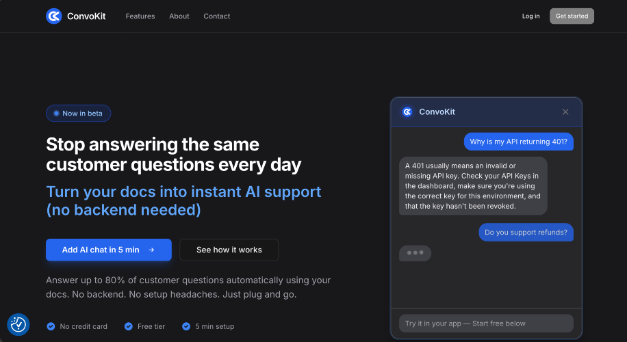 ConvoKit is an AI chat widget for SaaS websites that answers user questions instantly. It turns your documentation and FAQs into a smart support agent. You can integrate it in minutes -no backend or complex setup needed. It helps reduce repetitive support queries and improves response speed. Built for founders who want simple, scalable AI support.