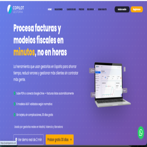 Copilot Gestoria automates 85% of repetitive tasks for Spanish accounting firms. AI-powered invoice OCR, AEAT tax models (303/111/130/190/390/100), VeriFactu compliance, bank reconciliation, and 24/7 client chat. Save 20 hours per month and up to 12000 EUR per year. Free 14-day trial.