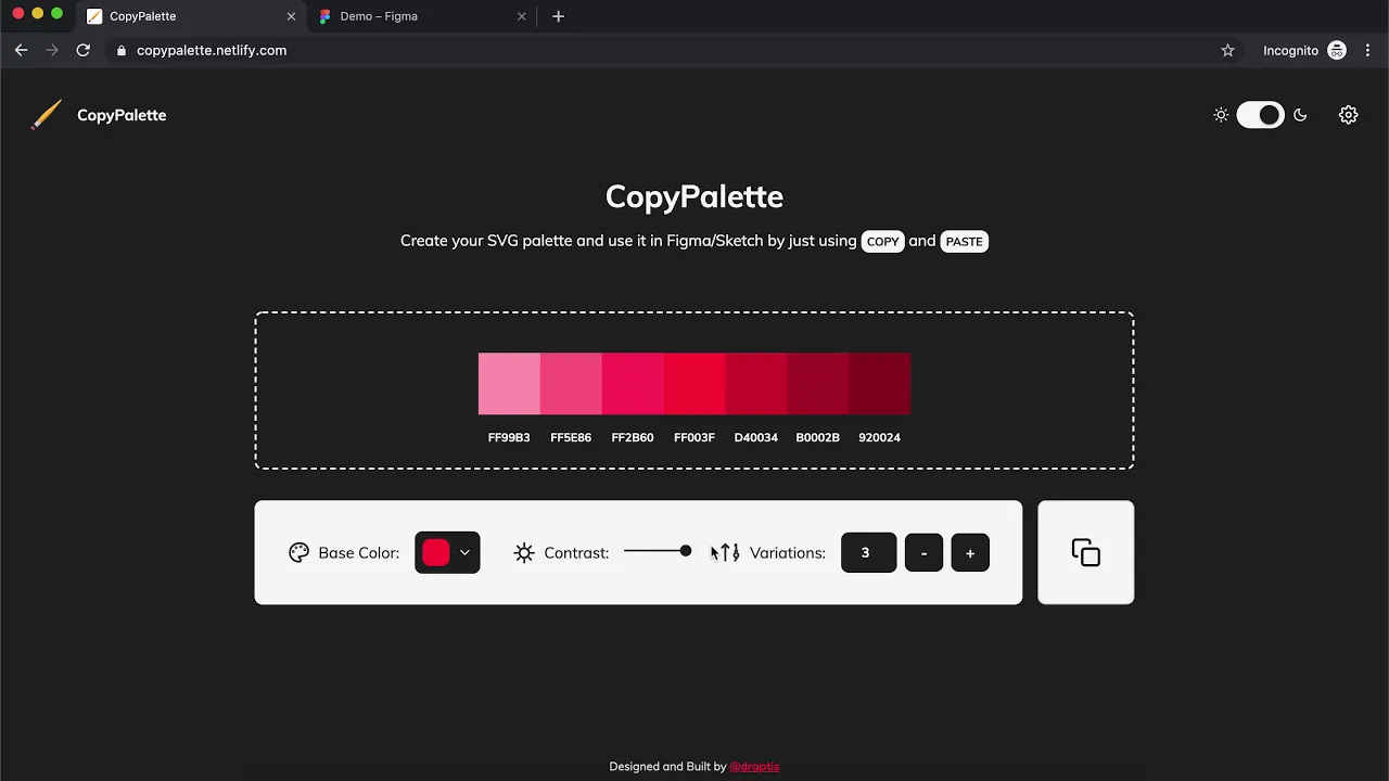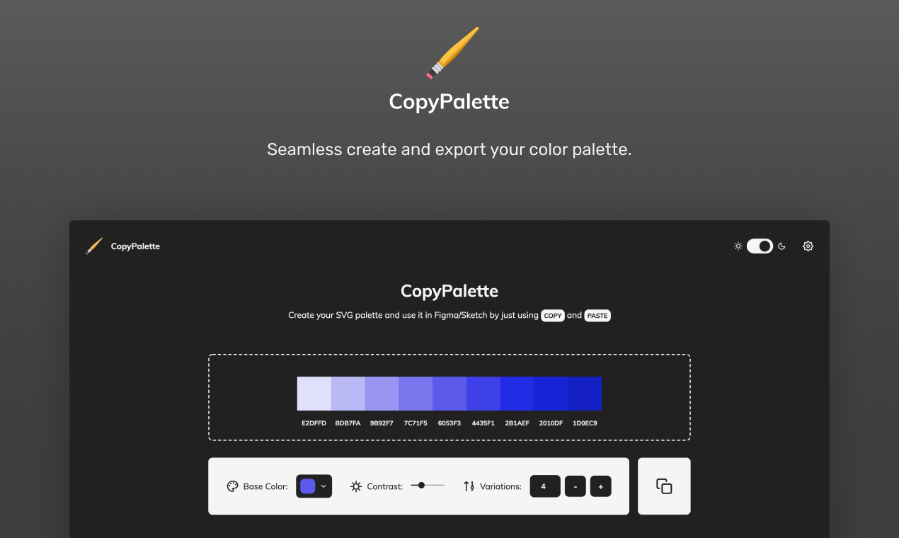 ?Idea: Every time I used to kickstart a UI design project, I had one repetitive struggle! Defining the color palette should be easy a walk in the park! However, the joy of designing was camouflaged with unlimited copy-paste commands of HEX/RGB codes. ? How: CopyPalette is a handy color tool that help you create and export monochromatic color palettes in a blink The export format is SVG, therefore the copy-paste command works with all the current prototyping tools, including Sketch, Figma, and Adobe XD. ? Features: - Fine-tune your palette by handling contrast, steps and the base(=middle) color. - Choose between 2 color palette appearances - Toggle Day/Night mode - Export in SVG format ? Tech Stack: - ReactJS - Styled Components - Material UI - Netlify