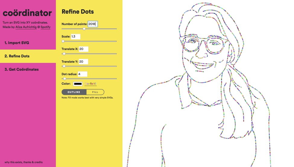 Coördinator is an open source browser interface to help you turn an SVG into XY coordinates. That means you can now take any SVG file, turn it into dots, and use those dots in a data visualization. How does it work? It’s all based on two simple, powerful SVG methods: SVGGeometryElement.getTotalLength() and SVGGeometryElement.getPointAtLength(). The first method gets the length of a path within an SVG. Then, you can divide the length into the number of points you want, and use the second method to get the XY coordinates of the points at those length positions. Coördinator handles multiple paths for you- These two methods work great to convert an SVG with a single path into a list of coordinates. But many SVGs have multiple paths. If you have a fixed number of dots you want in your shape, it requires a bit of math to make sure that your dots are evenly spaced between your different paths. Coördinator does that for you!