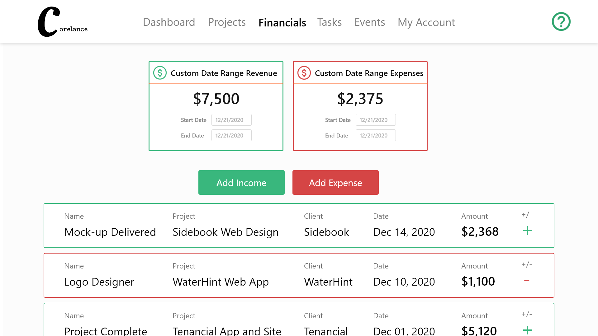 Corelance is a product for freelancers, to help them grow their business and spend less time managing it. By being able to manage projects, keep track of incoming and outgoing transactions, adding day-to-day tasks, and scheduling important events, you have all the essential features needed to succeed as an early-stage freelancer.