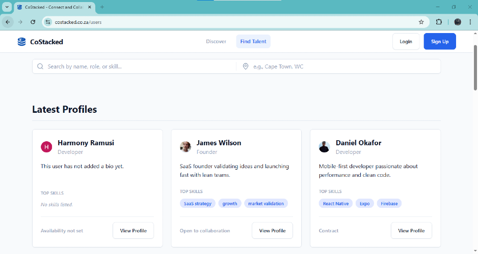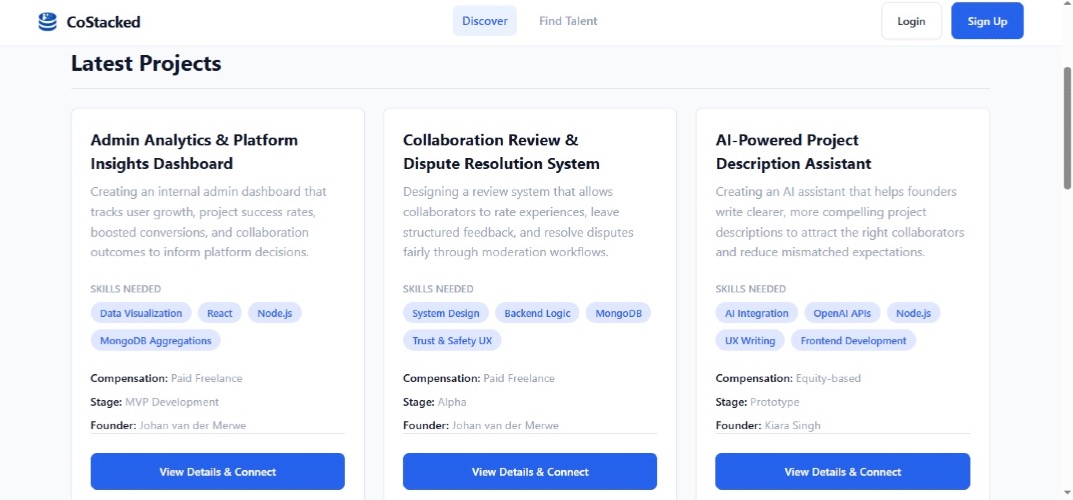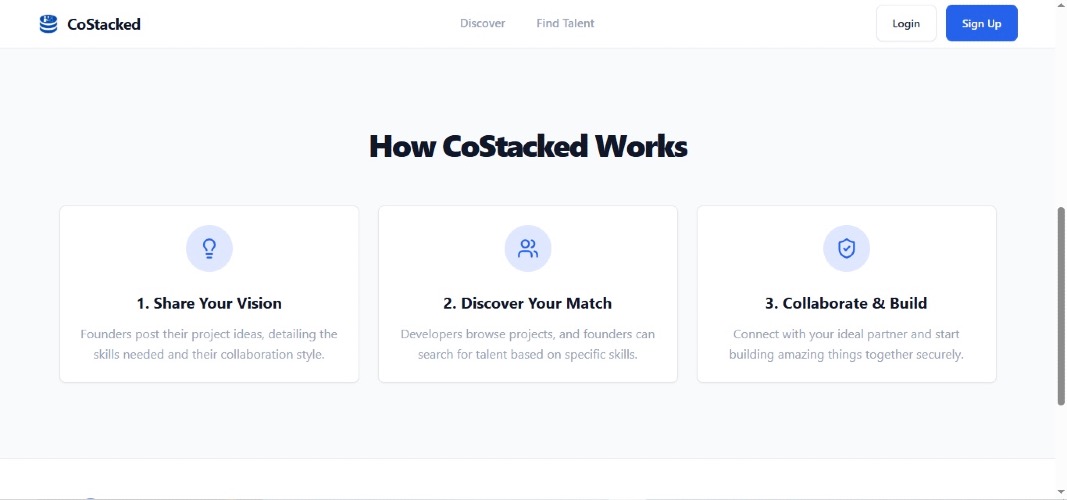 CoStacked is a collaboration platform that helps founders and developers work together on real projects with trust and clarity. It provides verified profiles, NDAs, reviews, messaging, and location-based search for both local and global teams. By reducing risk, misalignment, and wasted time, CoStacked enables startups to form stronger partnerships, move faster, and build products with confidence from idea to launch for early-stage founders and developers worldwide seeking scalable collaboration solutions.