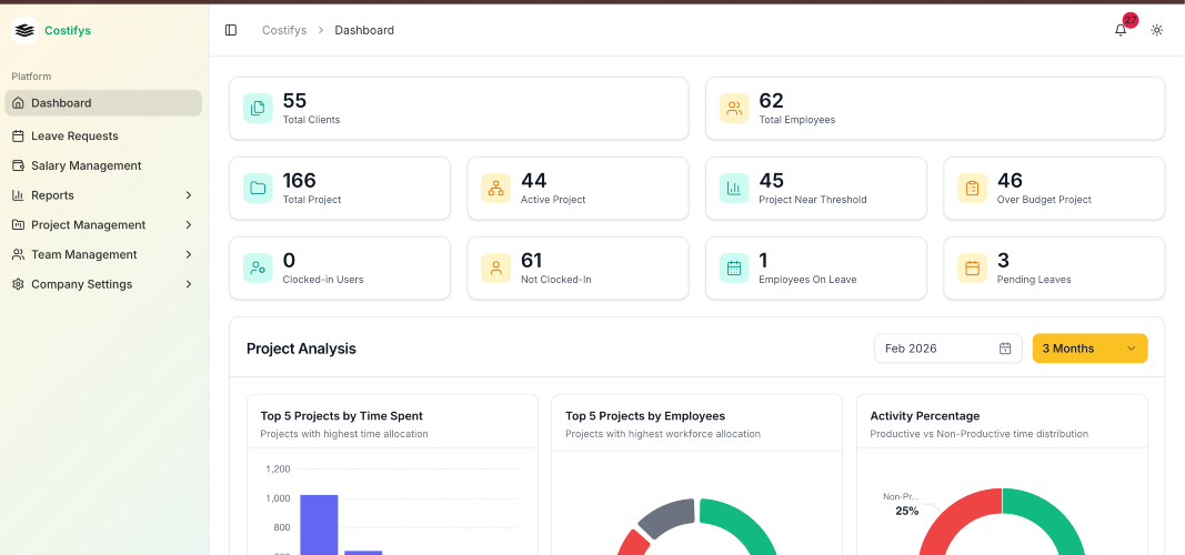 Costifys is a powerful project cost and time intelligence platform designed to help organizations run more efficiently, profitably, and transparently. Built specifically for project-driven businesses in India, Costifys gives you complete visibility into where your time and money are going in real time. From planning to execution and closure, Costifys enables teams to track project costs, time utilization, vendor expenses, and budget burn on a single platform. Instead of relying on spreadsheets and delayed reports, decision-makers get live insights to control overruns, improve margins,and forecast profitability before it’s too late.