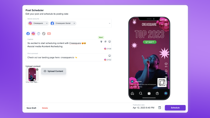 Creasquare is an Al-powered platform, that makes it easy to create graphic designs, videos and copywriting content. Schedule content to social media platforms, all in one place.