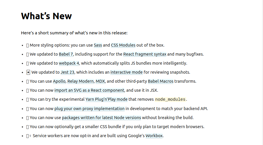 #What’s New -More styling options: you can use Sass and CSS Modules out of the box. -We updated to Babel 7, including support for the React fragment syntax and many bugfixes. -We updated to webpack 4, which automatically splits JS bundles more intelligently. -We updated to Jest 23, which includes an interactive mode for reviewing snapshots. -You can use Apollo, Relay Modern, MDX, and other third-party Babel Macros transforms. -You can now import an SVG as a React component, and use it in JSX. -You can try the experimental Yarn Plug’n’Play mode that removes node_modules. -You can now plug your own proxy implementation in development to match your backend API. -You can now use packages written for latest Node versions without breaking the build. -You can now optionally get a smaller CSS bundle if you only plan to target modern browsers. -Service workers are now opt-in and are built using Google’s Workbox.