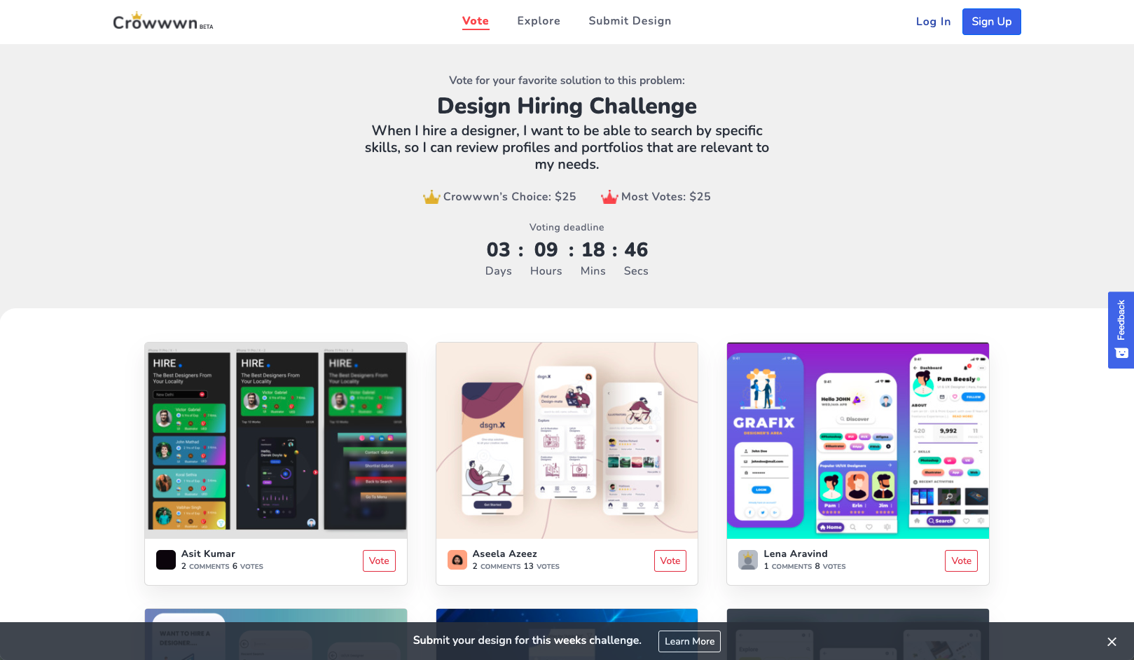 Crowwwn is a free weekly design challenge for UX Designers. Unlike other design challenges, Crowwwn focuses on giving each designer constructive feedback so they can improve each week. Each week designers can win cash prizes by being chosen by the Crowwwn team or one of our guest judges, or by having the most votes given by the Crowwwn community.