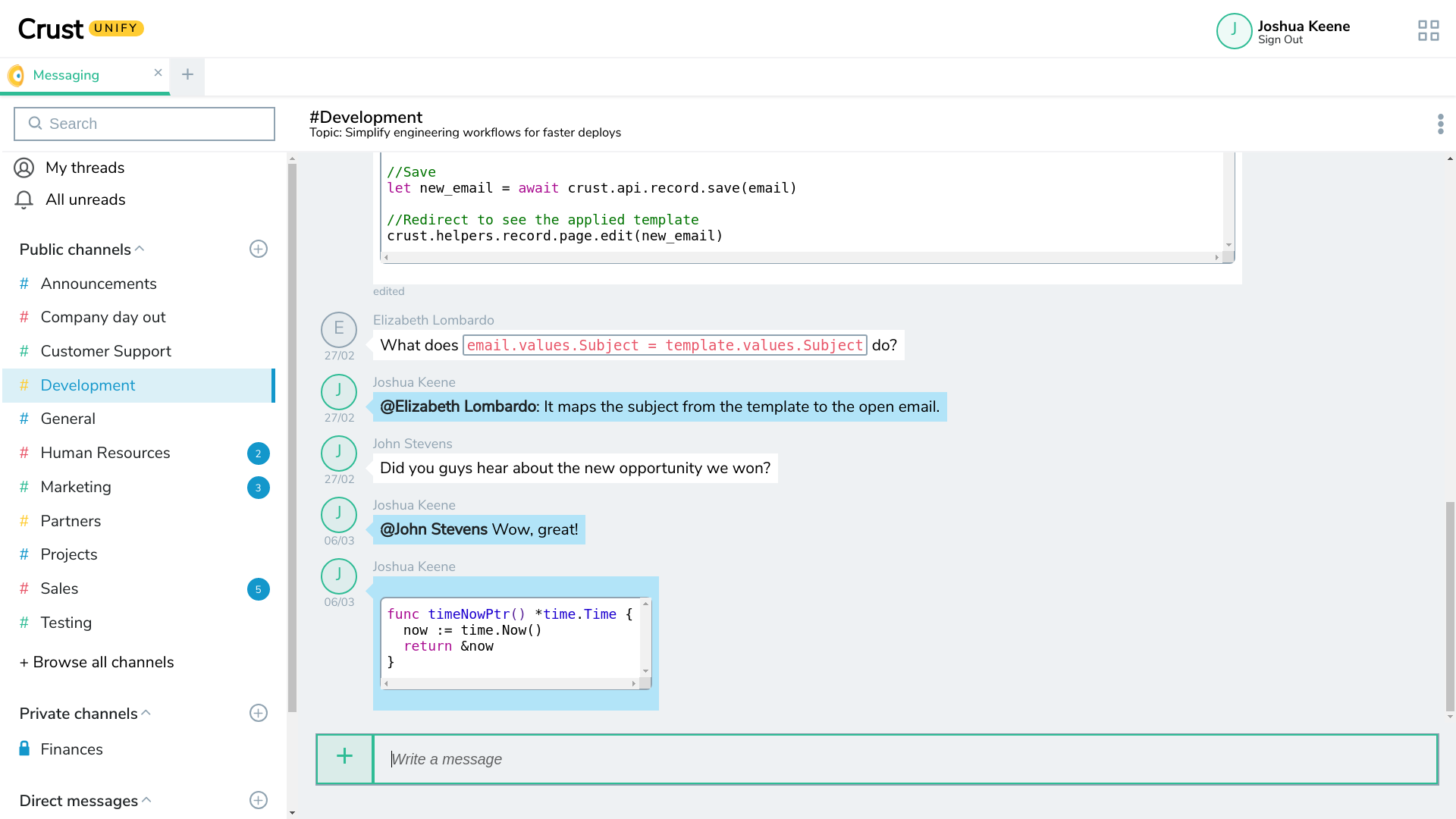Crust provides a flexible, self-hosted platform for your organisation to work and communicate internally while engaging with its customers, suppliers, partners and other third parties externally. Its integrated approach to identity, messaging and business logic delivers a simple-to-use yet extensible means for managing users and the applications they require every day, whether in the cloud, behind the firewall or a hybrid of the two. Crust CRM, Messaging, Unify and Compose can all be tailored to your organisation’s commercial, technological and human architectures. The Crust platform capabilities will be expanded over time to incorporate such features as cross-application automated workflows, Internet of Things (IoT) management and federated messaging. Crust Technology is headquartered in Ireland, but the Crust team is based across many countries. If you’re interested in joining in, please drop us a line. www.crust.tech Crust Technology Ltd. Unit 1G, The Atrium Blackpool Business Park Blackpool, Cork Republic of Ireland
