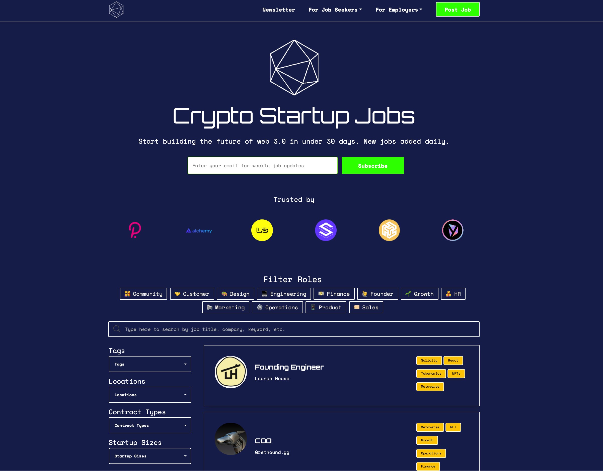 ?? gm! I'm Trustin, a serial maker who saw a disconnect between the newest crypto startups and job seekers in web3. I made cryptostartupjobs.com to empower the projects and people who are building the future of how the world operates by making recruiting for web3 roles highly efficient. So how is this different than other crypto job boards? ?‍? For early stage crypto startup employers: even before this launch, cryptostartupjobs.com has a mailing list of +1200 early stage crypto job seekers prior to any public launch. This number will be anticipated to grow tremendously upon launch day and for years to come. Many features will be added in the following weeks such as employer dashboards to track job post performance and applicant analytics, job seeker profiles, and an automatic weekly matchmaking feature powered by AI. All postings are $50 at the moment, but there are bundle deals available for multiple jobs as well as options to have the job posting featured for an additional $30. ?‍?For crypto startup job seekers: the job board is completely free, and you can subscribe to a weekly newsletter with the newest early stage crypto startup job updates. There are powerful filter and search features which will ensure you finding that perfect fit regarding position title, role, contract type, location, skills, company, and size. More features coming soon include signing up as a job seeker profile to attract employers as well as an automatic weekly matchmaking feature powered by AI. I hope folks can find this useful and please let me know any questions or feedback. If you’re hiring or looking for jobs at an early stage startup, checkout cryptostartupjobs.com ??