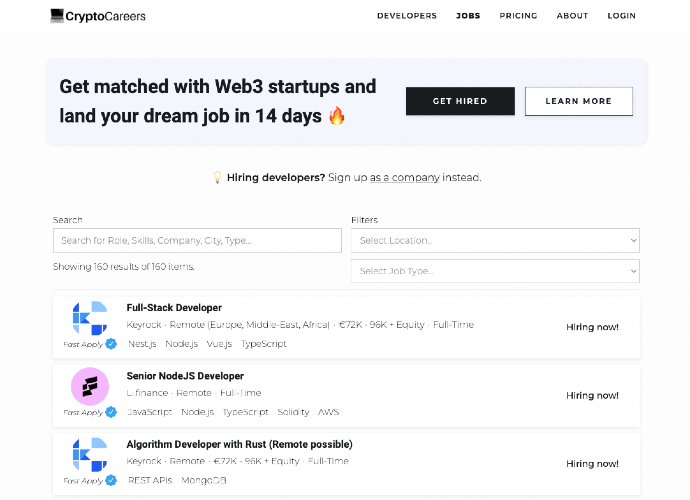 I've launched cryptocareers.dev, a hiring community for web3 developers. Our mission is to connect developers & startups to help build web3. It works like a reverse job board. Companies apply to developers, not the other way around. Sign up if you want to land your dream web3 job!