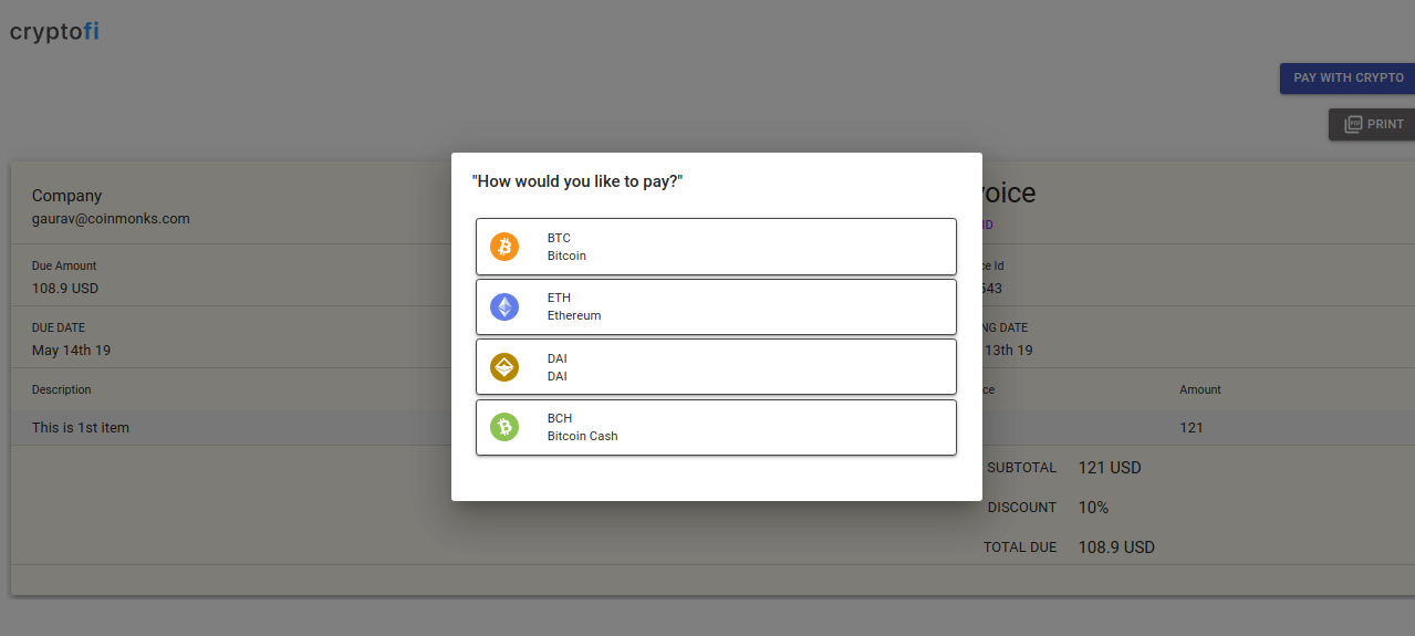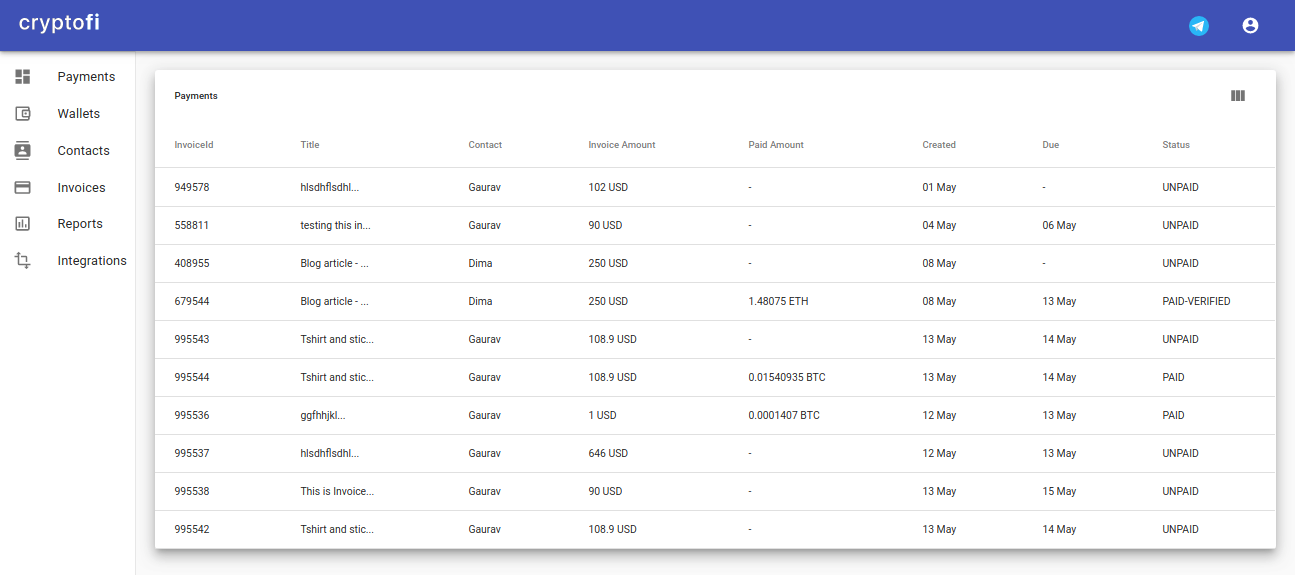 Cryptofi is the easiest and safest way to send, receive and track your Crypto Payments. Don't copy paste your address just create crypto invoices and get paid in crypto.