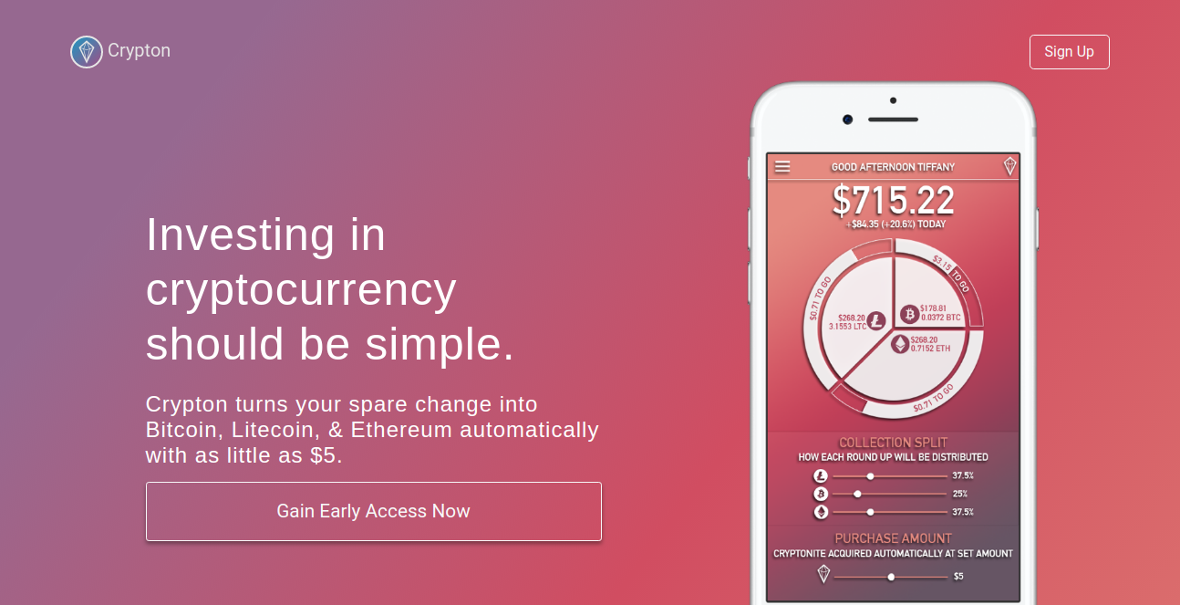 Effortlessly acquire digital currency automatically with spare change. Crypton provides the tech to round up your debit/credit card transactions to the nearest dollar and use the spare change to purchase various cryptocurrencies on a rolling & passive basis.