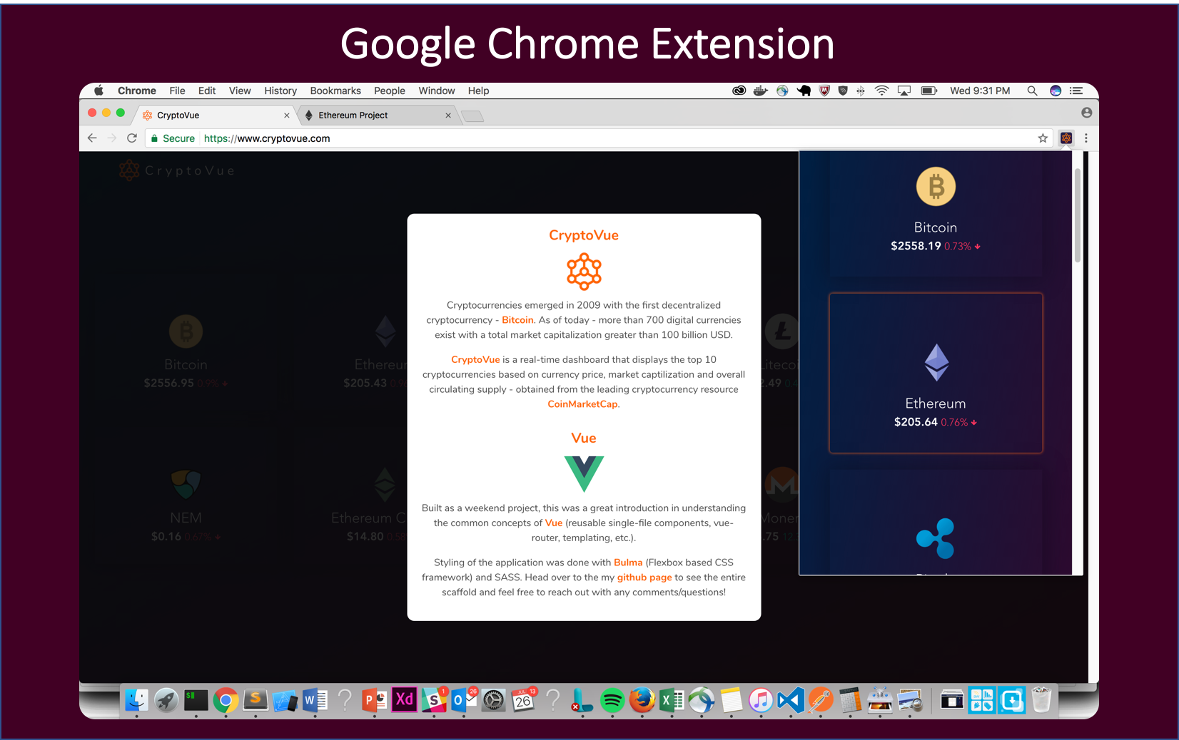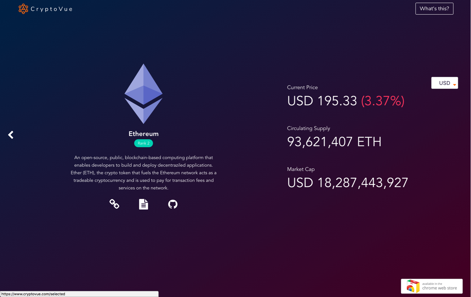 CryptoVue helps you stay up to date with the most popular cryptocurrencies based on market cap, price and overall circulating supply. Always real-time and up to date, CryptoVue obtains it's data from the leading cryptocurrency resource CoinMarketCap. CryptoVue has also just been made as a chrome extension as well to help folks check prices straight from their browser! https://chrome.google.com/webstore/search/cryptovue As always, feedback is more than appreciated! Cheers everyone. -- Hassan Dj