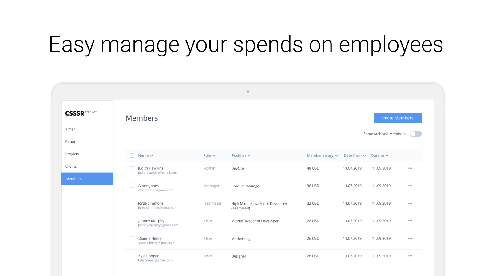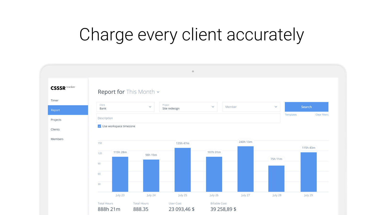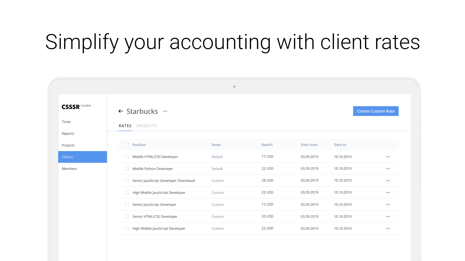 Are you agree your organization's money should be always below your eyes? Money is similar to blood in growing agency. That's why we were focused to make inner spends be clear as possible. Set up accurate rate for each member of your organization. Manage your employees' salary and assign them proper positions. Add contractors and freelancers to your workspace and spend NOTHING for them. Why so? Because we don't charge by members. And never will. Still asking your employees to work on timesheets? Don't waste their time and switch in real time mode. We'll make things done. Add your clients and set special rates for them. Deliver accurate reports with no additional edits. Keep your agreements always fresh: when rate is going to expire, we'll notify you by message.