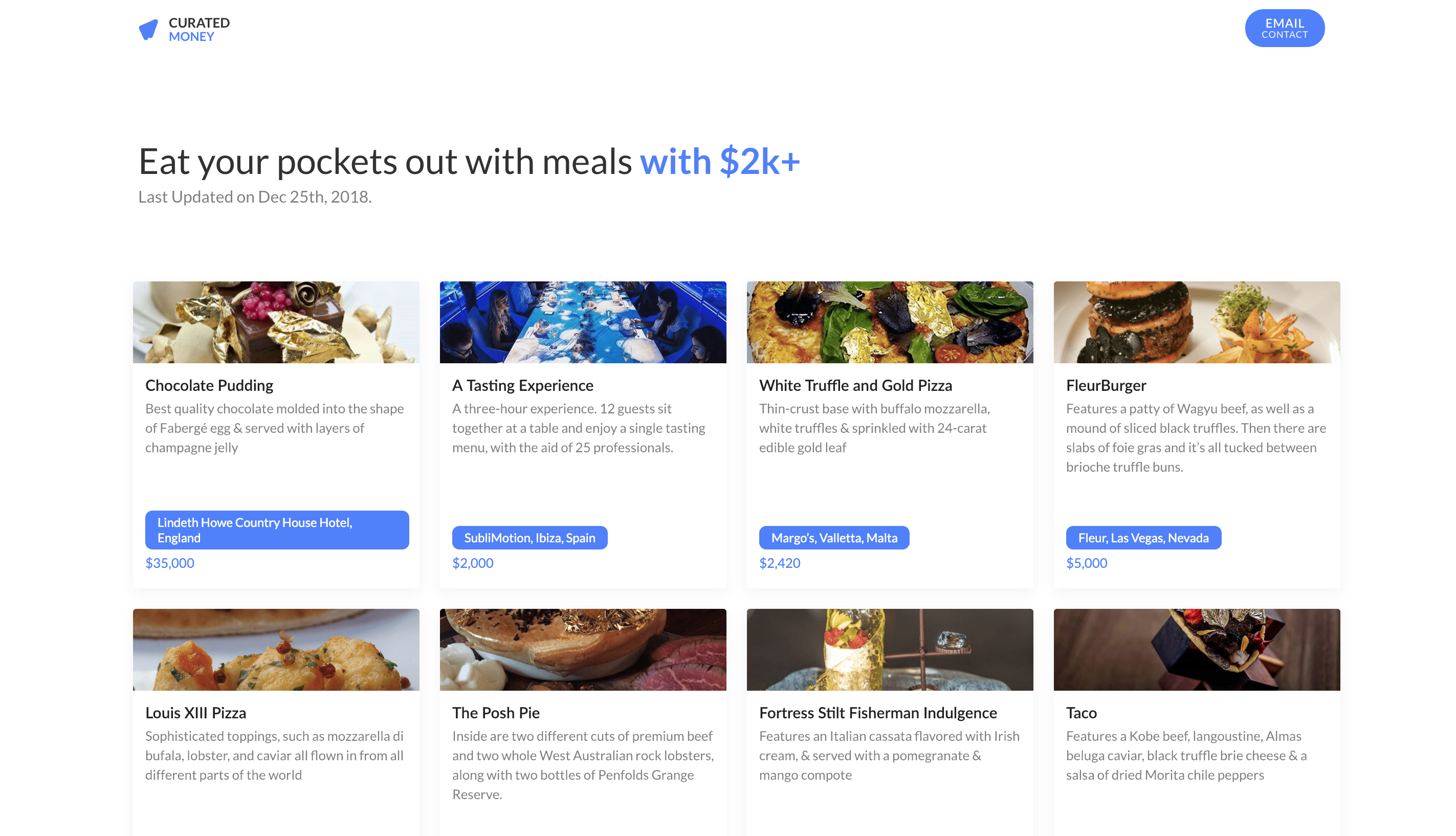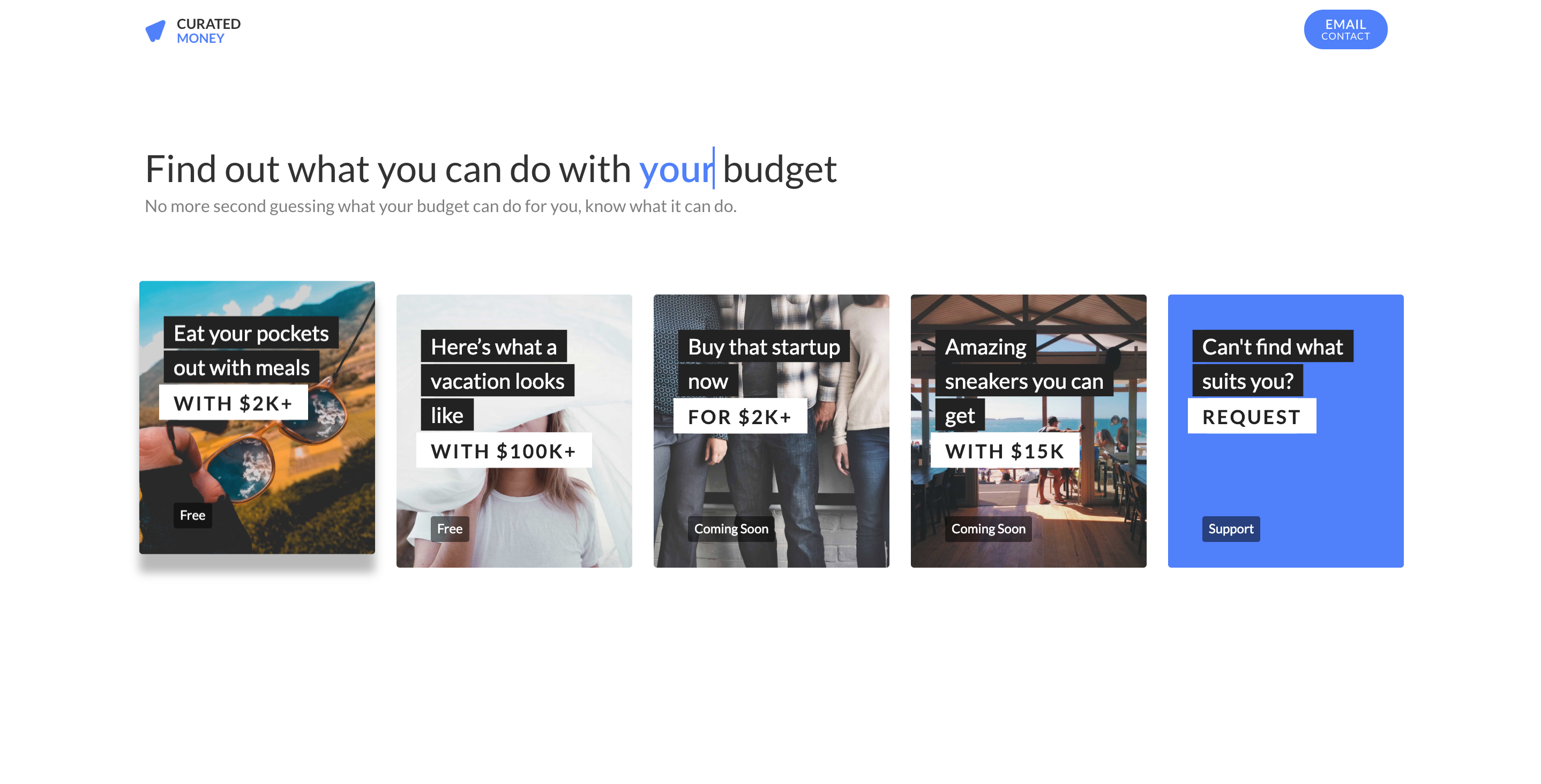 Curated Money is a curated selection of what you can do with your budget. You don't need to guess about it, you can easily find out. FIND. VIEW. $$