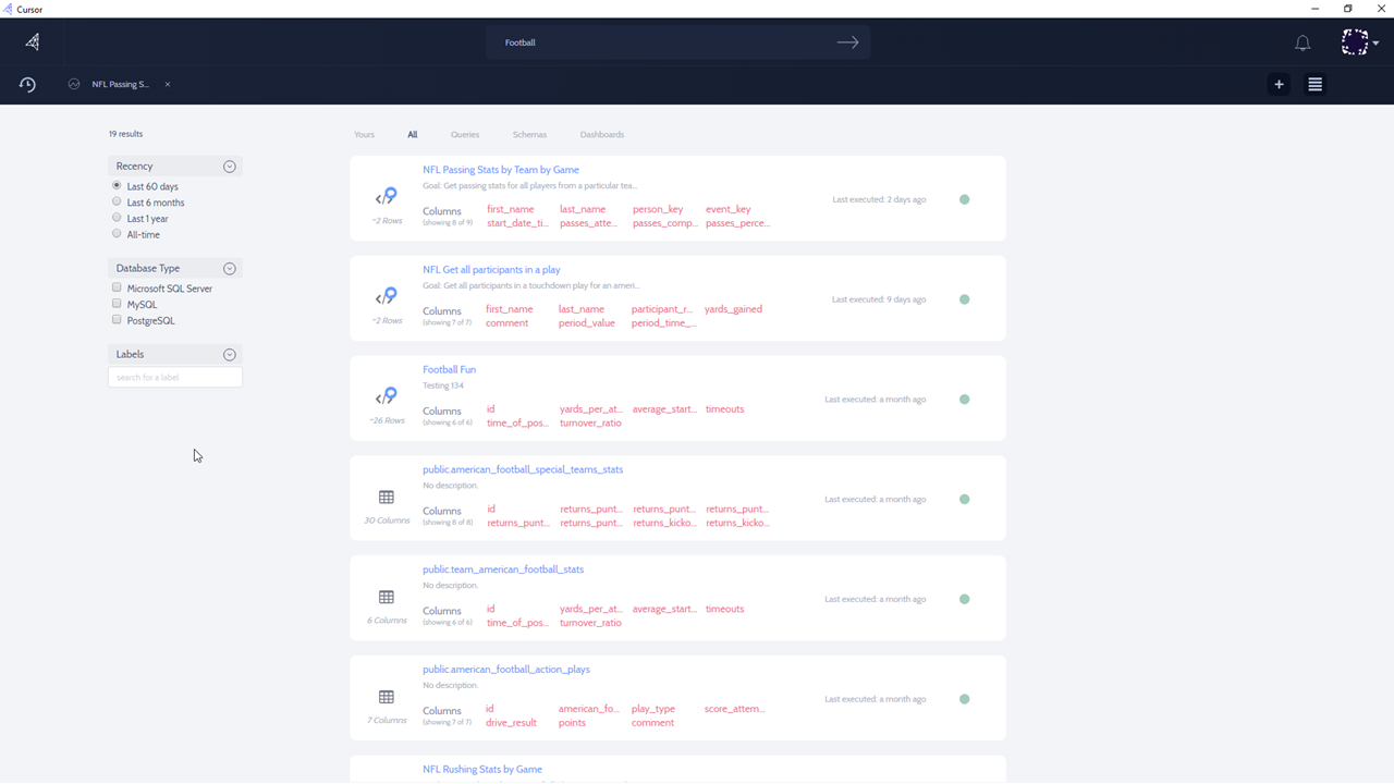 Cursor delivers a unified search experience across a company’s data assets — including queries, databases, and dashboards — making it easy for both business and technical users to quickly find the answer to any data question. Designed to scale from a single user to the largest enterprises, Cursor’s platform is easy and secure to deploy, and enables users to: -Search: Cursor searches across a company’s SQL queries, database metadata, and existing business intelligence platforms (e.g. Tableau, PowerBI, Looker, and more) to help pinpoint where the best answers live. -Execute: Cursor integrates a modern query editor that works with both on-premise and cloud-based databases. -Collaborate: By connecting business users and data practitioners, Cursor helps bridge the communication gap inside large enterprises while creating an organic history for future reference.