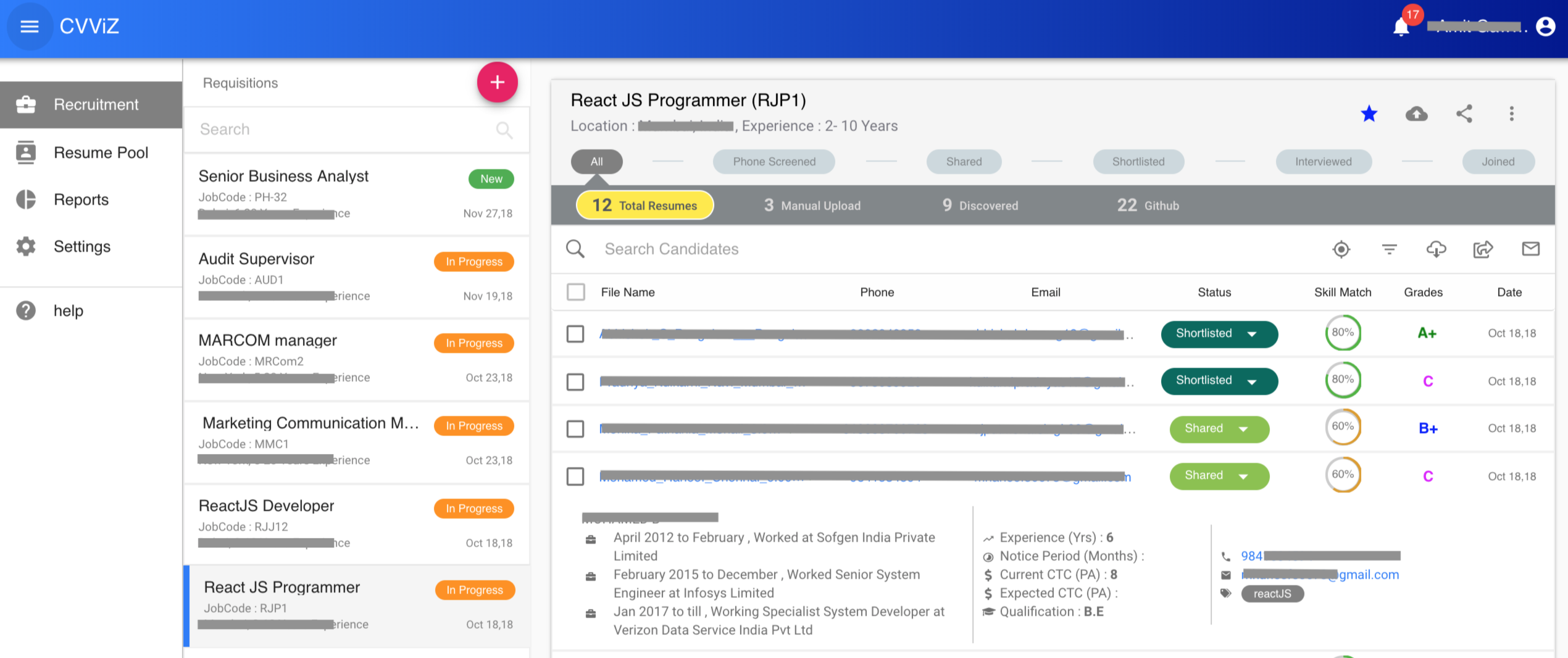 CVViZ is an Artificial Intelligence powered, cloud based software solution for recruitment. Our proprietary machine learning and NLP based algorithm helps recruiters to connect with the RIGHT / Most suitable candidates in quickest time. Machine learning based algorithm used in CVViZ mimics the human/technical panelist behavior. It goes beyond traditional approach of keyword or binary search and presents recruiter with the most suitable candidates for the job. We look into hard skills of candidates, the kind of projects they have worked on, the kind of work culture they are coming from and many more. CVViZ also provides complete recruitment workflow automation. It provides cloud based centralized repository with capabilities such as quick search, advance search, maintaining talent pipeline, automated candidate sourcing, etc. We also provide insights using data analytics into their recruitment where one can quickly check how they are doing with recruitments, can validate their next recruitment plan, etc.