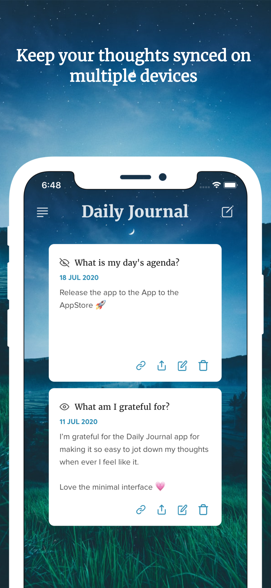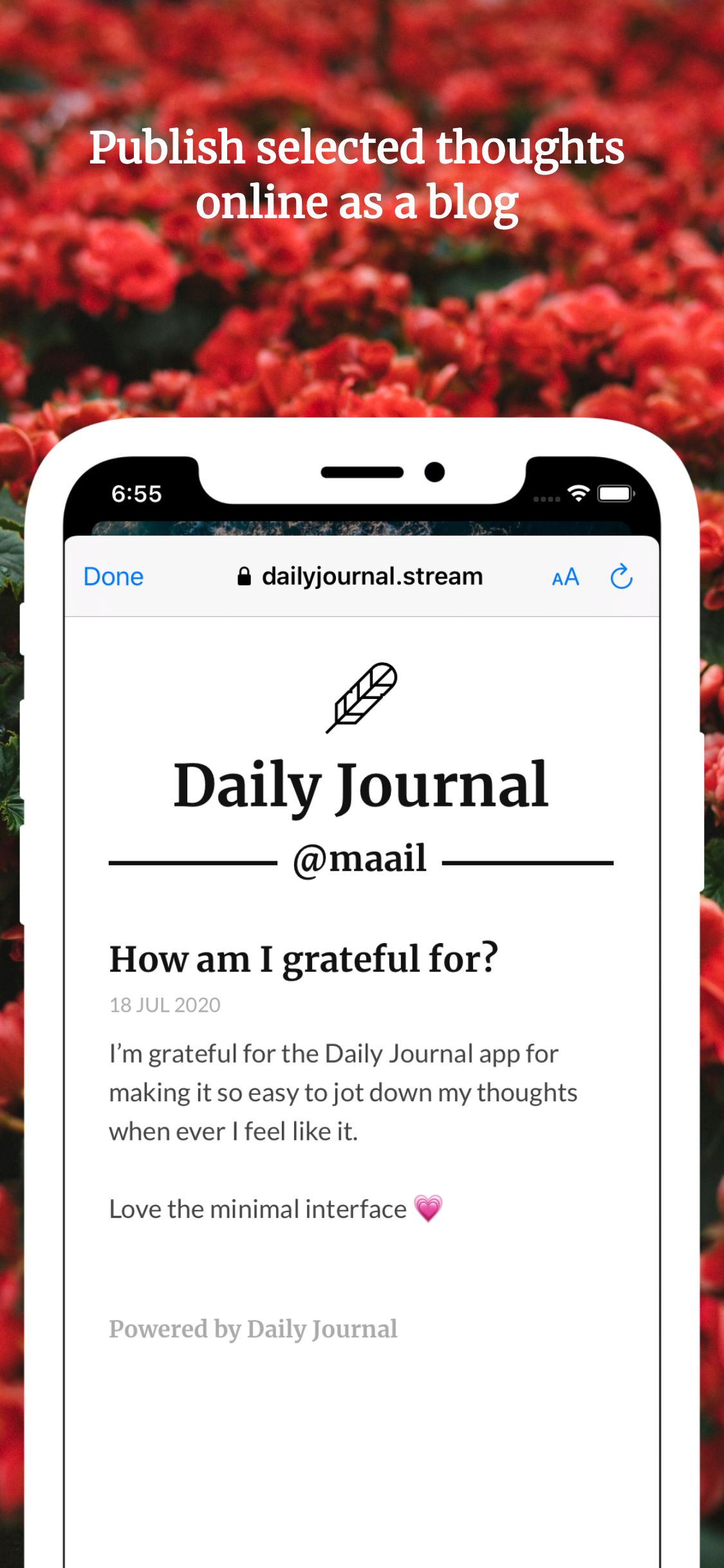 Daily Journal started out as an app that I made for myself, to learn SwiftUI and to start Daily Journaling. I started adding more features that I wanted to see in the app and it ended up being something different than the journaling apps out there. I wanted something minimal. Just go in and to journal daily, so I created the most minimal text editor, and I loved how it turned out. I wanted something different every day, so I came up with themes for each day, supplied by beautiful curated backgrounds from Unsplash contributors. Each photographer is credited on the day of the wallpaper. So be sure to check them out. I wanted to share some of my entries online as a blog, which ended up a bit tricky to do but I love the final result. Entries you choose to share, are generated as a static HTML page and they are placed on dailyjournal.stream under you username. Custom domains are possible, and this will be available if anyone is interested. I'm thinking of creating different blog templates, which is pretty exciting as well. Publishing feature I've added as a monthly subscription of 1.99USD per month. This includes a free 7 day trial, you can cancel any time. So please be sure to check this feature out. ? Other features are completely free. Some of the those other features are: - Reminders (opt-in only) - Daily Journaling Cues: This changes based on the timing of the day - FaceID/TouchID unlock - Syncing between multiple devices: Currently only available for iPhone and iPad. MacOS soon, and Android if I get enough support on the iOS versions - Privacy: All your journal entries are encrypted and private - Share journal entries as an image to social networks - There is also an additional easter egg you'll see if you use it for more than a day. ? I've got more features in the pipeline. You can go in and vote on these on Daily Journal's Roadmap here on Trello. You would need to be signed in to Trello to do so: https://trello.com/b/vbSpHeoS/ro... Let me know what you think. Looking forward for your feedback. Thank you.