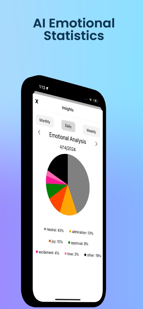 A smart new way to regulate your emotions. Daily Nightly works by taking nightly journal entries and finding patterns with the help of AI to send you the most relevant positive affirmations. Utilizes machine learning to extract text from journal entries, rank the emotions based on 26 core emotions, and send you the most helpful positive affirmations at the right time. Boost your emotional intelligence easily.