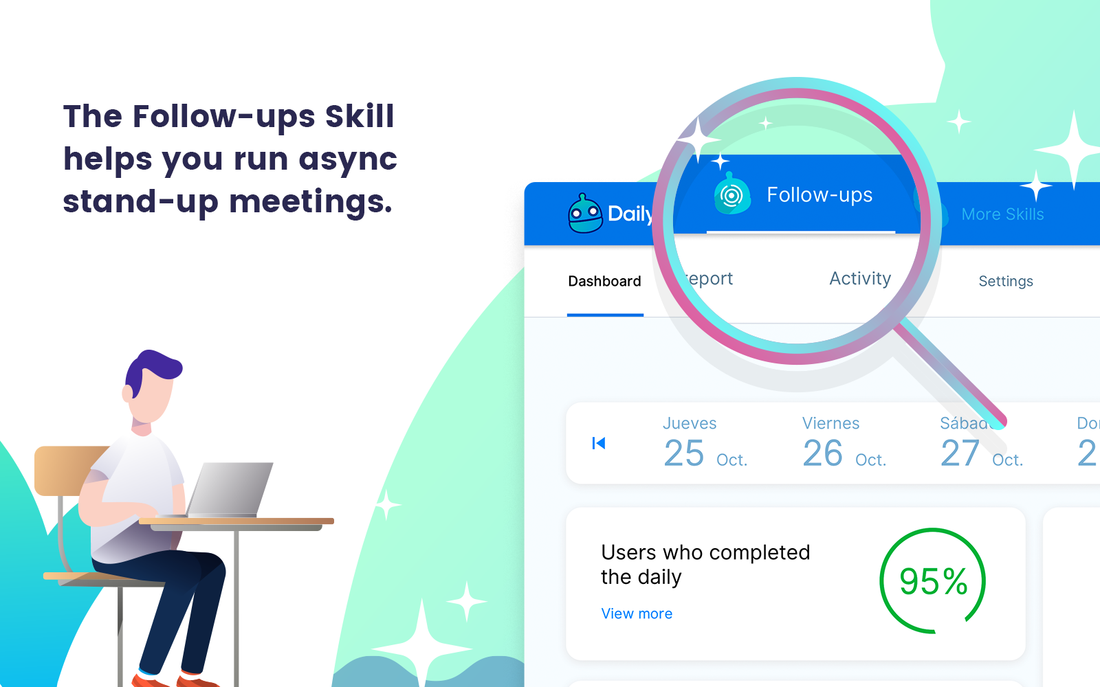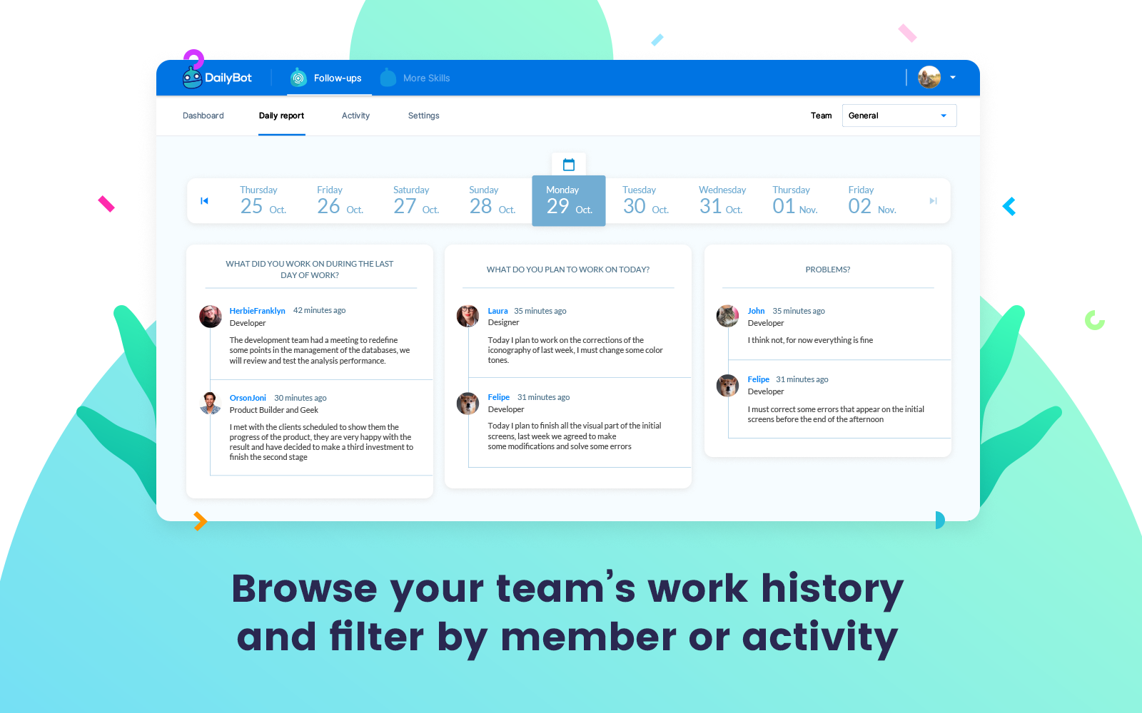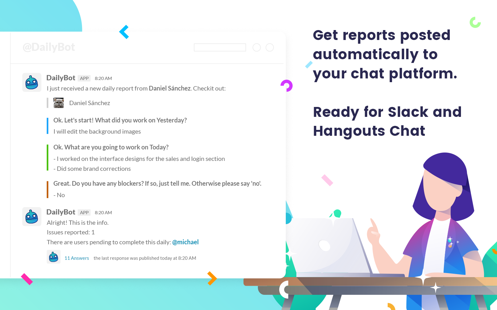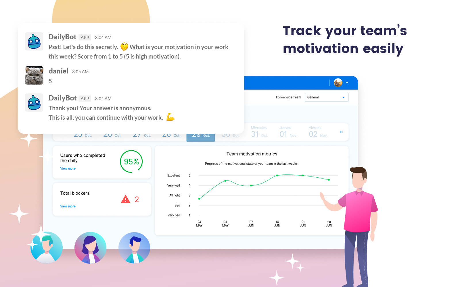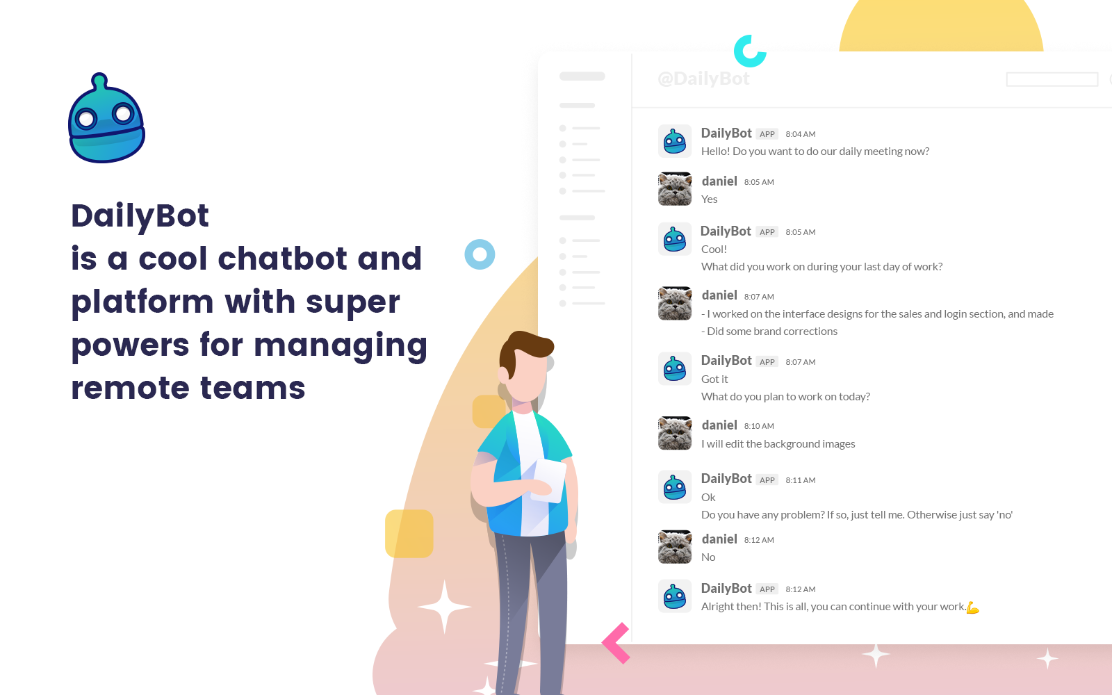 Hi Hunters! ? — the frequent and the occasional :) DailyBot ? is a chatbot assistant powered by Skills (or super powers) that help you automate your team daily workflows. Our product is built with the remote community in our top of mind ? — as a fully remote team, we are giving our 2 cents to make the work of every remote worker smoother and even more fun! We’re not only building for remote teams, our product brings great benefits to any on-site team as well. We just like to highlight that every feature, Skill and detail is thought to be super remote friendly. We’ve been working hard re-architecting our product/tech for our demanding growth and polishing and re-launching this Follow-ups Skill. It is totally inspired on the Scrum Standup meetings practice, but adapted for remotes that require more asynchronous communication and multiple time zones. It integrates a vacation mode and a team motivation tracker ?. DailyBot smoothly collects information about what your team has done the day before, what they’re doing Today and whether they have blockers or not, and then shares the information to your chat platform or via email digests. Your team will never lose a daily standup anymore! There is always access to the history with search and filters through the web dashboard. The motivation tracking is anonymous for the respondent and managers can see the chart with the trend so they can react to motivational issues and empower and bring the energy back to the team! ? DailyBot Follow-ups connects easily and smoothly to Slack and Google Hangouts Chat. New integrations are about to come. Use DailyBot for free and sign-up to stay in the loop about the new super cool Skills that we’ll be launching. …aaand of course please let us know what you think about it. All the feedback is well received, with much love!